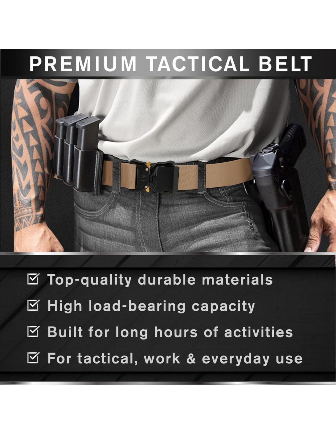 - Nuestros cinturones tácticos están hechos de materiales de la más alta calidad. La cinta de nylon es resistente y duradera en rendimiento. Con una mínima absorción de agua, se mantiene seca y conserva sus propiedades en cualquier condición climática. El nylon proporciona una elasticidad moderada, de modo que el cinturón se estira, manteniendo siempre su alta resistencia. Resistente pero ligero, es la elección perfecta para cualquier ocasión. Nuestros cinturones están diseñados para mantenerte cómodo en el trabajo y en el uso diario.