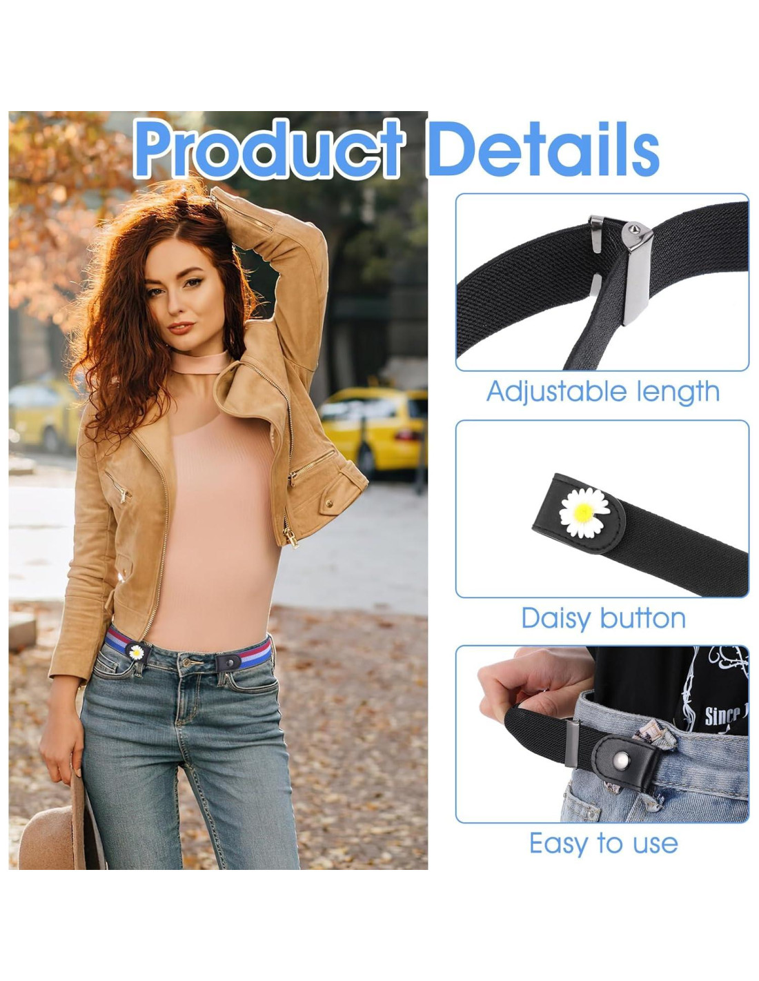 - [Material de Alta Calidad] Cinturón de material de alta calidad para mujeres sin hebilla, hecho de tela, con un elegante diseño de margarita, cuero que no se cae fácilmente, sin sujetadores, cuero que no se cae fácilmente, diseño simple con banda elástica es especialmente adecuado para hombres, mujeres y niños.