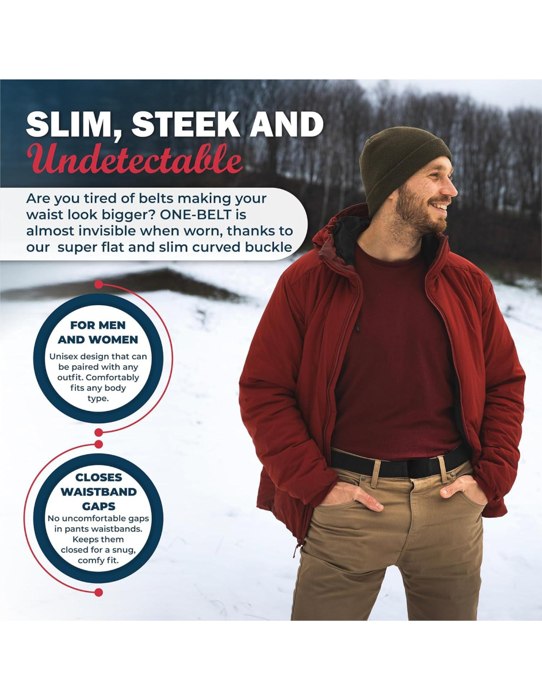 - Hebilla sin mostrar - Sin espacio en la banda de la cintura. La hebilla de los cinturones de One-Belt para mujeres y hombres está diseñada para ser discreta y sutil. Sin hebillas voluminosas o abultadas - puede permanecer plana e invisible debajo de las camisas. Además, el gel antideslizante en la parte posterior del cinturón sostiene los pantalones pesados y cierra el espacio en la banda de la cintura.