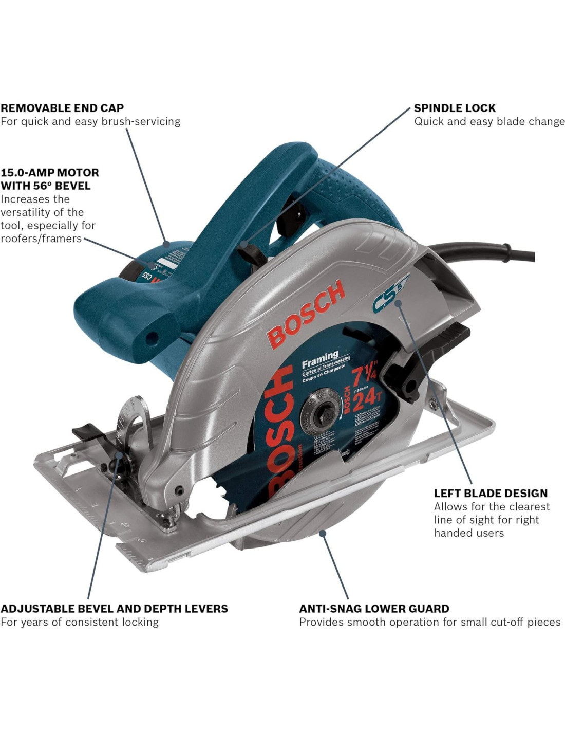 Descripción del Producto A través de 80 años de desarrollo de herramientas y accesorios innovadores para el profesional del concreto, BOSCH se ha convertido en el líder reconocido en la industria. Con una línea robusta que puede abordar todo, desde las tareas de perforación de concreto más difíciles hasta la eliminación de materiales, BOSCH es una empresa cuya legado está escrito en concreto. Si el proyecto requiere trabajo en concreto, desde pulido y anclaje hasta eliminación de materiales, solo hay un lugar al que acudir para una solución completa. Confíe en BOSCH para proporcionar las herramientas y accesorios de grado profesional para hacer el trabajo correctamente. Ideal para la eliminación de materiales de gran área de cal, yeso, yeso de acabado duro, arenisca y concreto abrasivo. La unión de metal duro incluso resiste cargas causadas por materiales fuertemente abrasivos. Uso óptimo: asfalto, concreto fresco, piedra pómez, concreto de nivelación, concreto aireado, yeso, asfalto fundido, piedra caliza blanda y mortero de yeso. Puede usarse en: basalto, concreto viejo, tubos de concreto de piedra, piedra caliza natural, cuarcita y arenisca. Del Fabricante La sierra circular Bosch CS5 de 120 voltios y 7-1/4 pulgadas es una herramienta para profesionales conscientes del valor que se centran en las necesidades del usuario principal. La ligera CS5 entrega 15 amperios de potencia y un diseño de hoja a la izquierda para la línea de visión más clara al cortar. La protección inferior anti-enganchamiento le permite hacer cortes sin tener que avanzar la protección, incluso al hacer cortes en bisel.