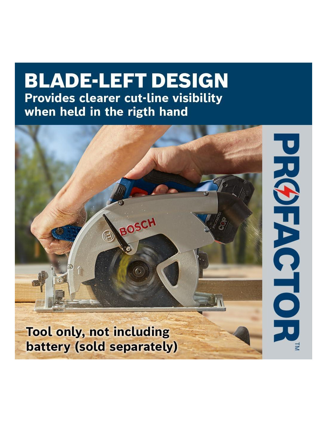Esta sierra circular ofrece un rendimiento con cable a partir de una sierra inalámbrica de 18V de 7-1/4 In. La Bosch GKS18V-26L 18V Sierra Circular Izquierda de 7-1/4 In. tiene una capacidad de corte de 2-5/8 In. (6,67 cm), cortando fácilmente a través de material 2X ("dos por") en todo el rango de bisel. El diseño de sierra a la izquierda de esta sierra proporciona una vista más clara de la hoja para una mejor visibilidad de la línea de corte cuando se sostiene en la mano derecha. Es parte del Sistema PROFACTOR, que combina la Tecnología BITURBO Brushless con una Batería de Alta Potencia CORE18V. La Tecnología BITURBO Brushless es un motor de alto rendimiento y un sistema de transmisión diseñado para ofrecer potencia comparable a herramientas con cable de alta demanda. Tiene un rango de bisel de 0-50 mientras que el mango auxiliar mejora la estabilidad y el manejo. Presenta un mango auxiliar diseñado a una altura exacta para permitir cortes rectos guiados de 2X. La sierra tiene un puerto pivotante de 360 que dirige el polvo lejos del cuerpo cuando la sierra se sostiene en cualquiera de las manos. El diseño de sierra a la izquierda permite que el peso de la herramienta repose sobre la pieza de trabajo en lugar de en su mano para cortes de desgarre con la mano derecha.