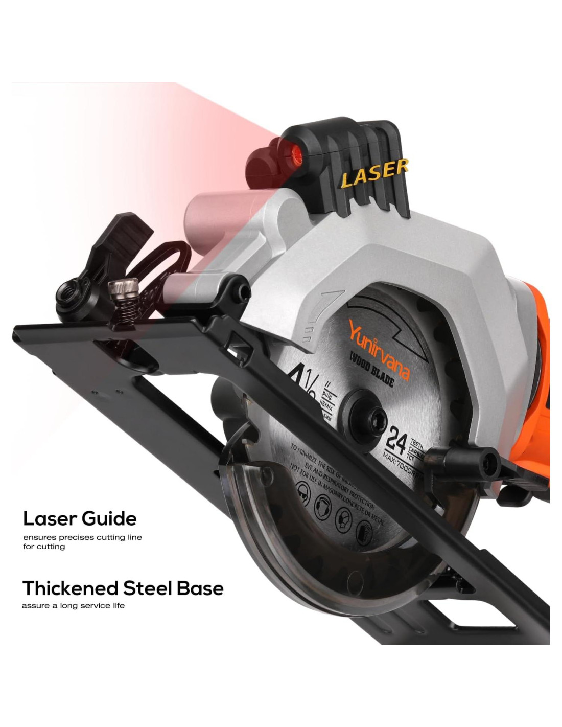 - Guía láser: Para asegurar un corte paralelo, la guía láser está disponible en nuestra sierra circular compacta; Con el indicador láser como guía durante el proceso de corte, tu línea será iluminada por el haz, asegurando una línea de corte profesional y precisa