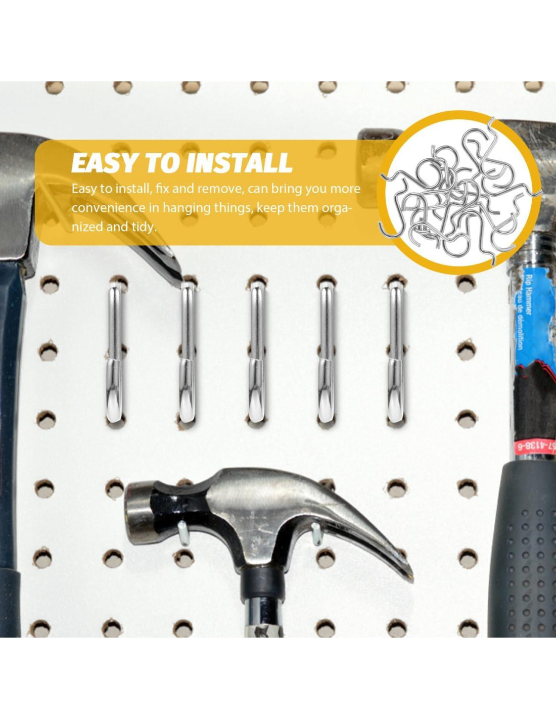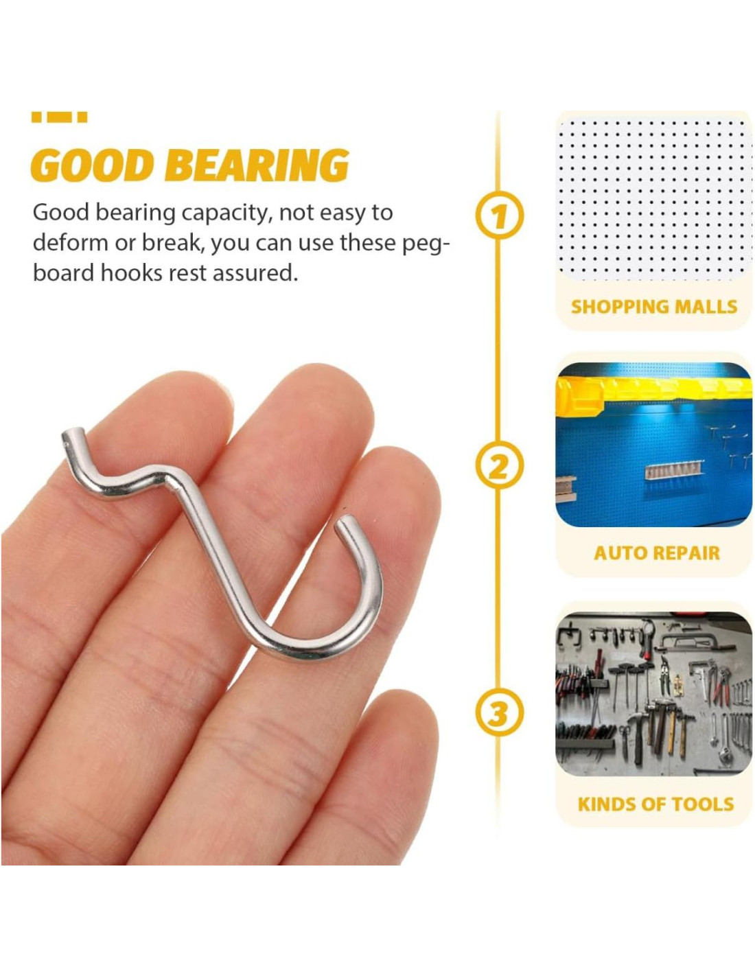 - Construcción: Hechos de hierro resistente, estos ganchos para tablero de clavos están diseñados para soportar cargas pesadas sin doblarse ni romperse, asegurando un uso a largo plazo en tu tienda o garaje