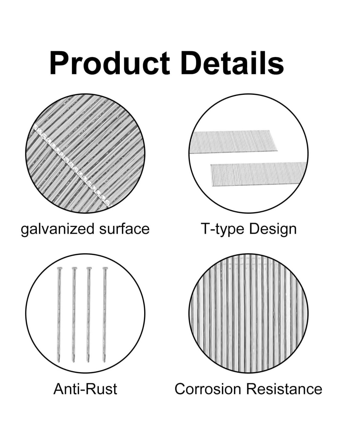 - Característica: Estos clavos se clavan profundamente en los materiales base para asegurar un agarre firme y duradero; La cabeza en forma de T y la punta en cincel con fuerte penetrabilidad harán que usar el clavo sea muy fácil, sin atascos para tu clavadora de 18 gauge.