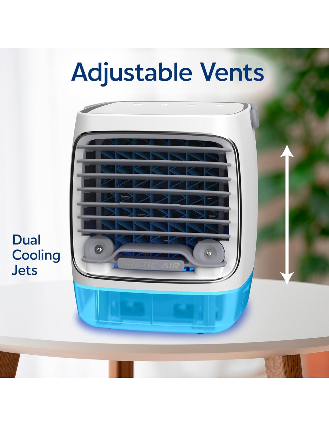 Arctic Air Turbo Chill para Enfriamiento Personalizado Ayuda a combatir el calor y mantenerse cómodo con el Arctic Air Turbo Chill, el enfriador evaporativo compacto diseñado para espacios personales. Ya sea que estés trabajando en tu escritorio, relajándote en tu dormitorio o preparando comidas en la cocina, esta unidad ligera ayuda a entregar aire fresco y humidificado. Simplemente llena el tanque con agua (agrega hielo para un enfriamiento extra), y estarás en camino de disfrutar de una brisa refrescante justo donde la necesitas, sin necesidad de instalación. La oscilación de amplio ángulo ayuda a circular el aire sobre un área más amplia, mientras que la rejilla ajustable te permite dirigir el flujo exactamente donde lo deseas. Un asa de transporte incorporada hace que moverlo de una habitación a otra sea conveniente, y una ventana de agua de vista rápida te permite monitorear los niveles de agua de un vistazo. También es eficiente en energía, listado por ETL, y viene completo con un adaptador de corriente y una guía de instrucciones. Ya sea que te estés enfriando después de un entrenamiento o trabajando en una calurosa tarde de verano, Arctic Air Turbo Chill es tu enfriador portátil de referencia. El tiempo de funcionamiento variará dependiendo de la configuración de velocidad, los niveles de temperatura de la habitación y los niveles de humedad de la habitación. Solo para uso en interiores. Usa menos electricidad que un aire acondicionado de 6,000 BTU.