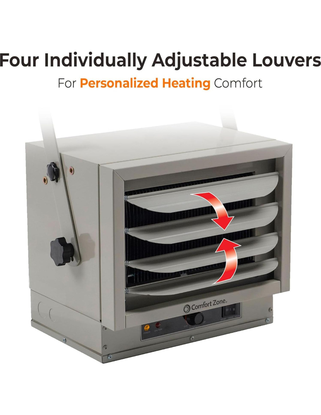 Calentador de Techo Potente - Ideal para uso en un garaje o taller, este potente calentador de montaje en techo Comfort Zone proporciona mucha calidez sin ocupar espacio valioso en el suelo. El potente calentador comercial es excelente para crear un ambiente cómodo para todo, desde trabajos y proyectos de bricolaje hasta simplemente un área de reunión fresca para amigos y familiares. Construcción de Acero Robusto - Diseñado para un uso prolongado en entornos difíciles, este calentador forzado por ventilador está fabricado con un cuerpo de acero de alta resistencia. Esto le permite resistir caídas y picos de temperatura repentinos que puede encontrar en áreas mal aisladas. Calefacción Dirigida - Las rejillas y un ángulo de montaje variable le permiten dirigir el flujo de aire del calentador comercial de 240 Voltios hacia un área con corrientes de aire o hacia su estación de trabajo habitual, asegurando que el calor vaya donde más se necesita. Controles Manuales Simples - El calentador cuenta con un doble botón en la parte frontal que le permite ajustar rápida y fácilmente el termostato o encender y apagar la unidad. Los controles simples hacen que sea fácil ajustar la salida de calor al nivel justo para su espacio. Características de Seguridad Inteligentes - Un sensor incorporado apaga inmediatamente el calentador de montaje en techo forzado por ventilador si alcanza una temperatura insegura para prevenir el sobrecalentamiento. La unidad también cuenta con una luz de encendido que indica claramente cuando está en uso, ayudándole a asegurarse de que esté apagado de manera segura antes de salir de la habitación.