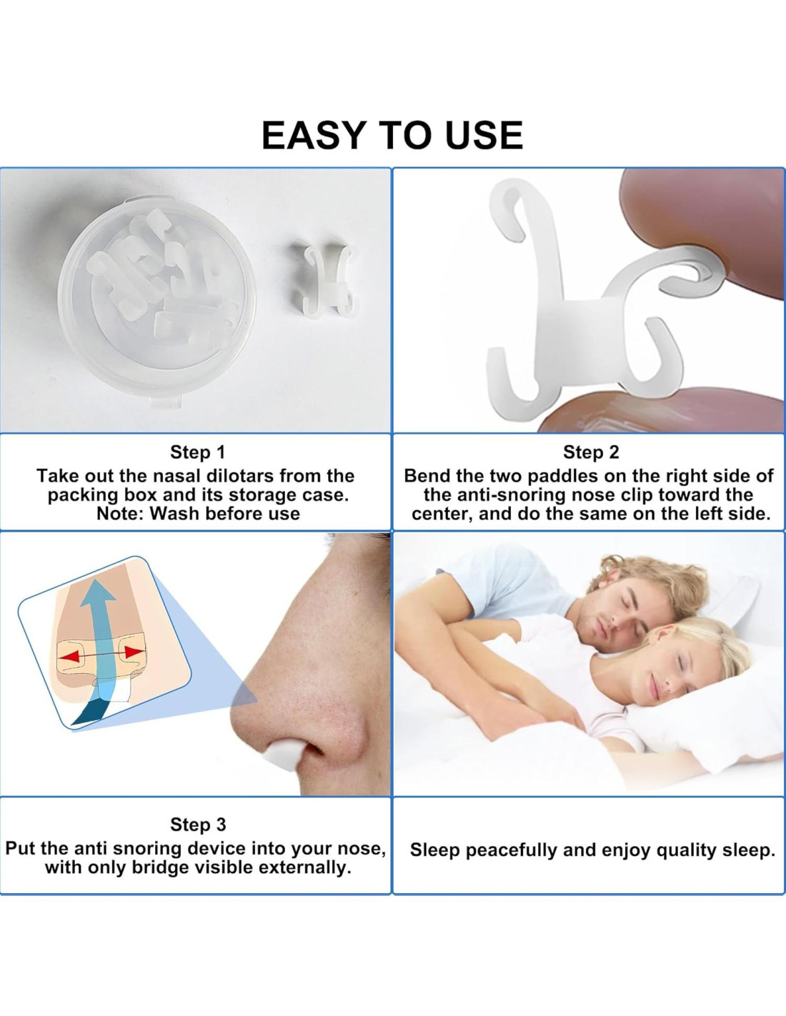 - FÁCIL DE USAR - El diseño simple hace que nuestros dilatores nasales para respirar sean fáciles de usar. Sigue el ángulo natural de tu nariz, inserta los clips nasales para ronquidos y luego ajusta cada lado para un ajuste seguro y un flujo de aire óptimo.