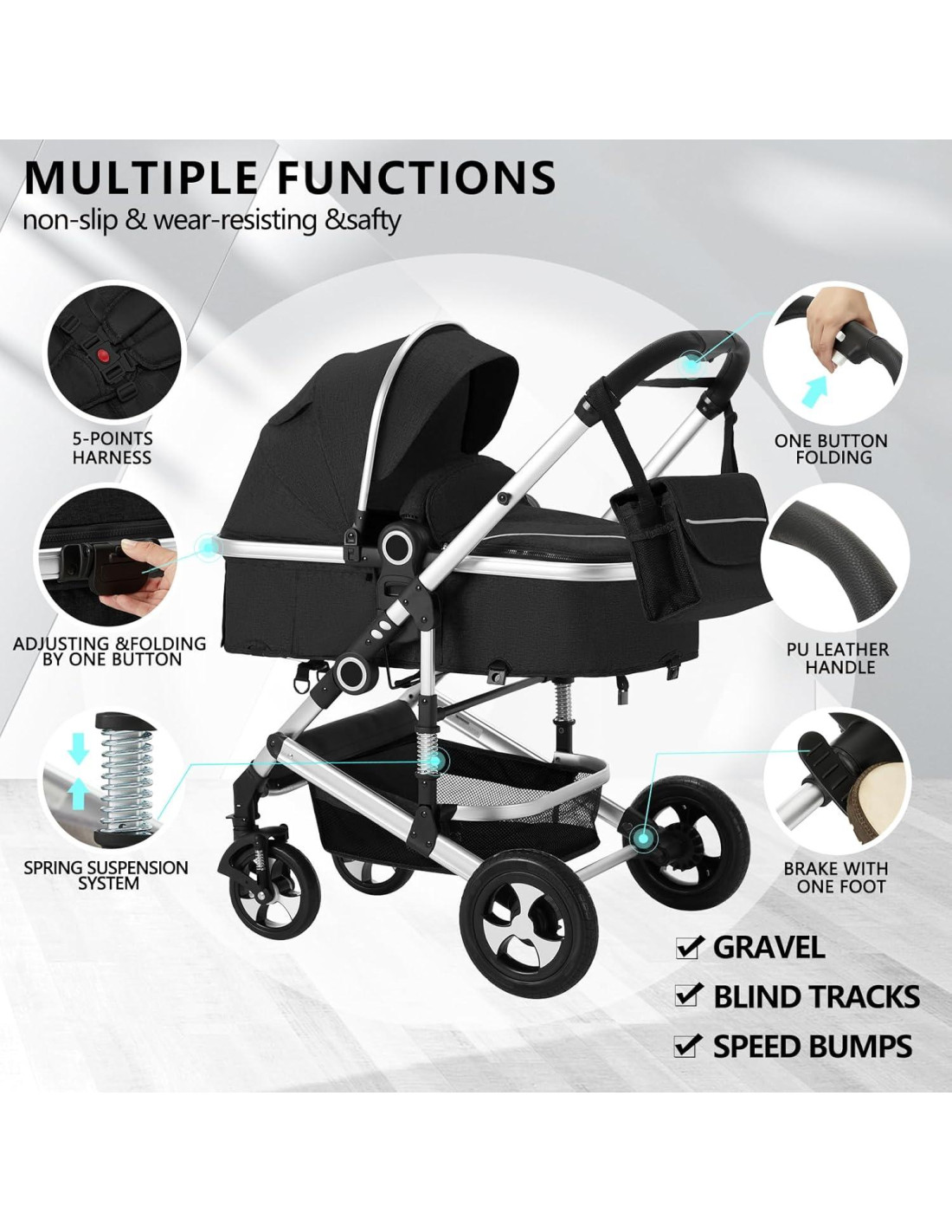 - Diseño Plegable y Portátil: Fácil de ensamblar y sin herramientas; Las ruedas delanteras pueden girar 360 grados o mantenerse rectas; Adecuado para viajes familiares o salir; Partes adicionales: cojín suave, una red para mosquitos, un portavasos, una bolsa de pañales