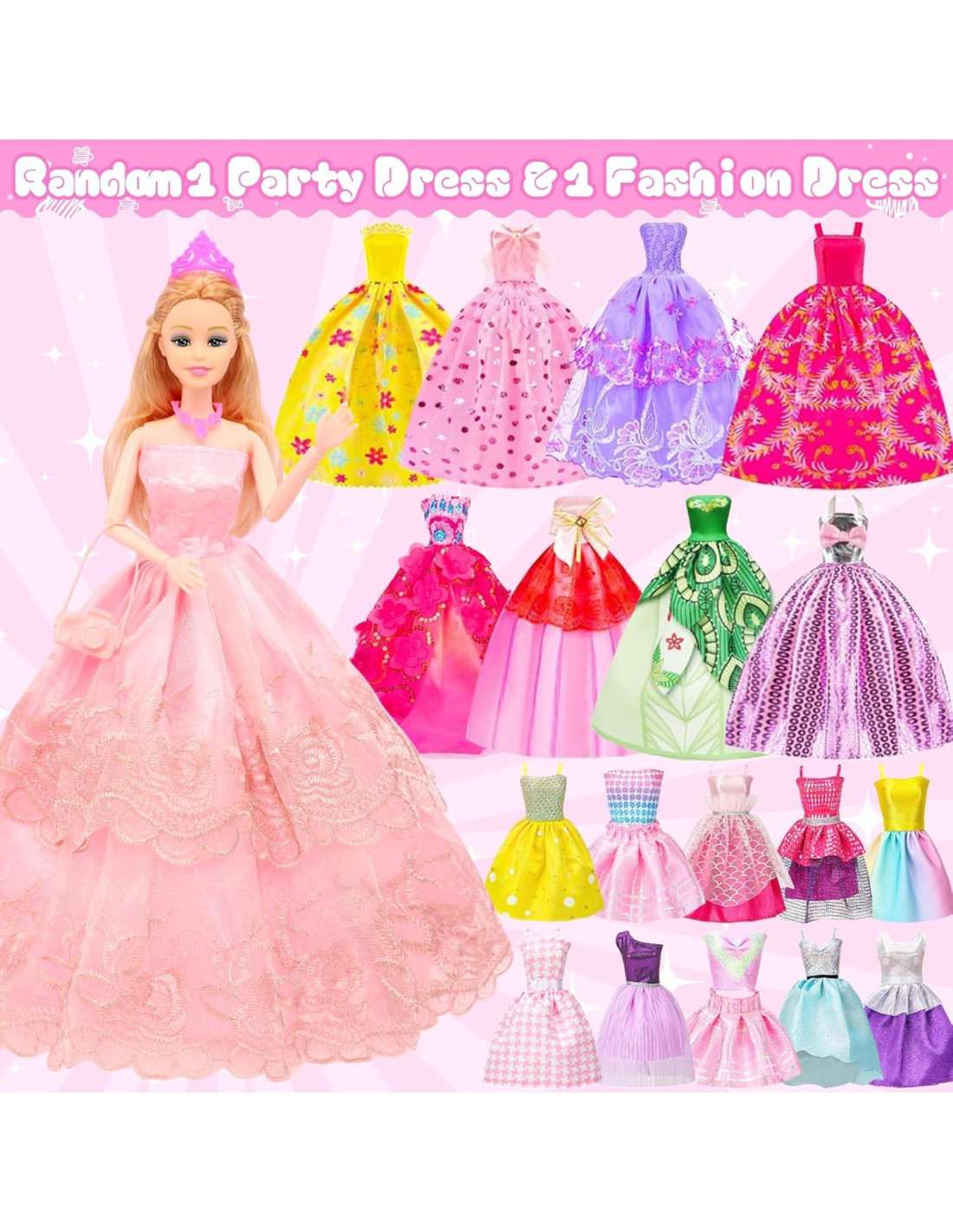 - El paquete incluye 78 PCS: 1 coche juguete convertible elegante, 1 muñeca de 29.2 cm, 1 vestido elegante, 3 vestidos regulares, 1 vestido de moda, 40 accesorios para muñeca de 29.2 cm, 10 mini perchas para ropa de muñeca de 29.2 cm, 11 zapatos para muñeca de 29.2 cm