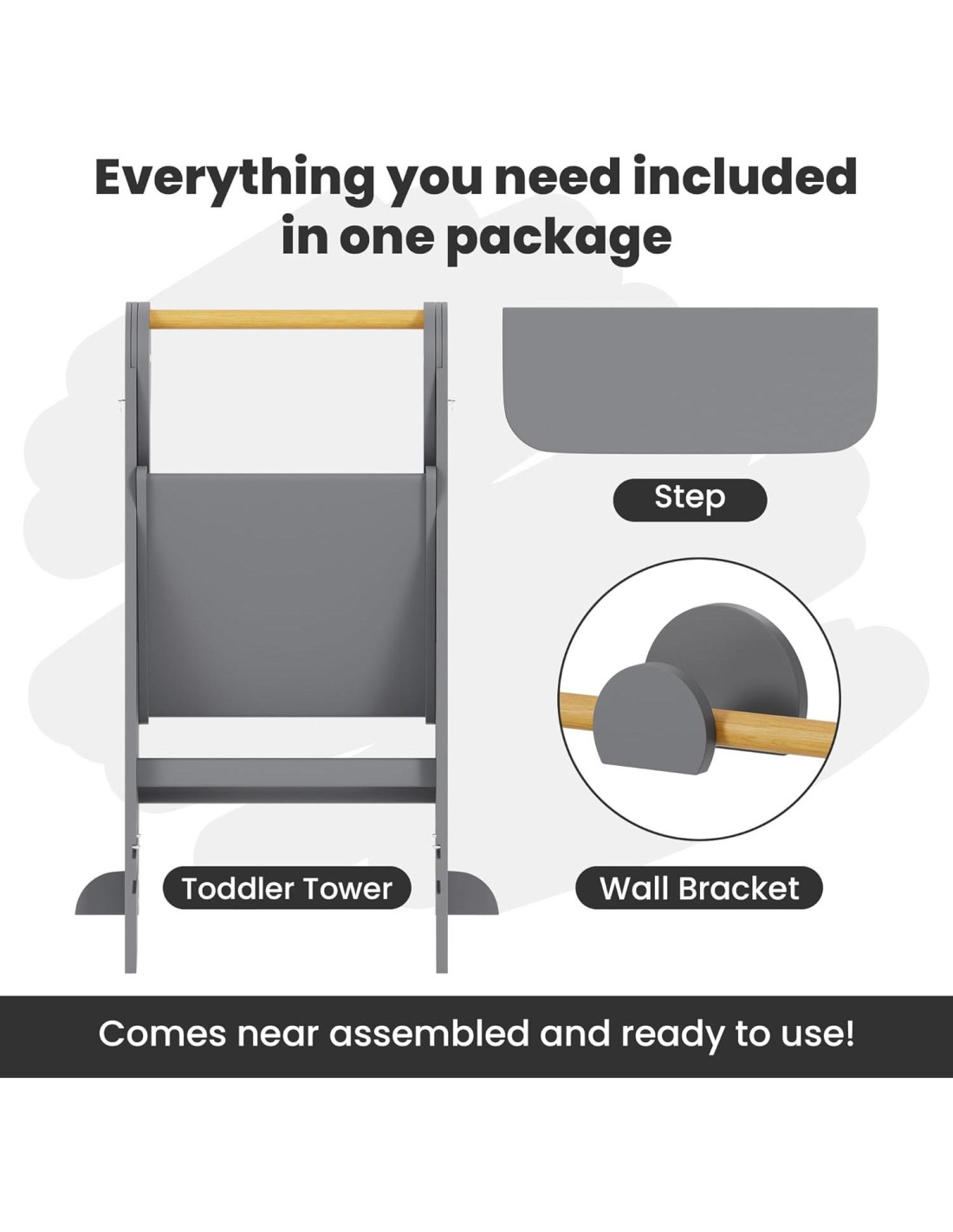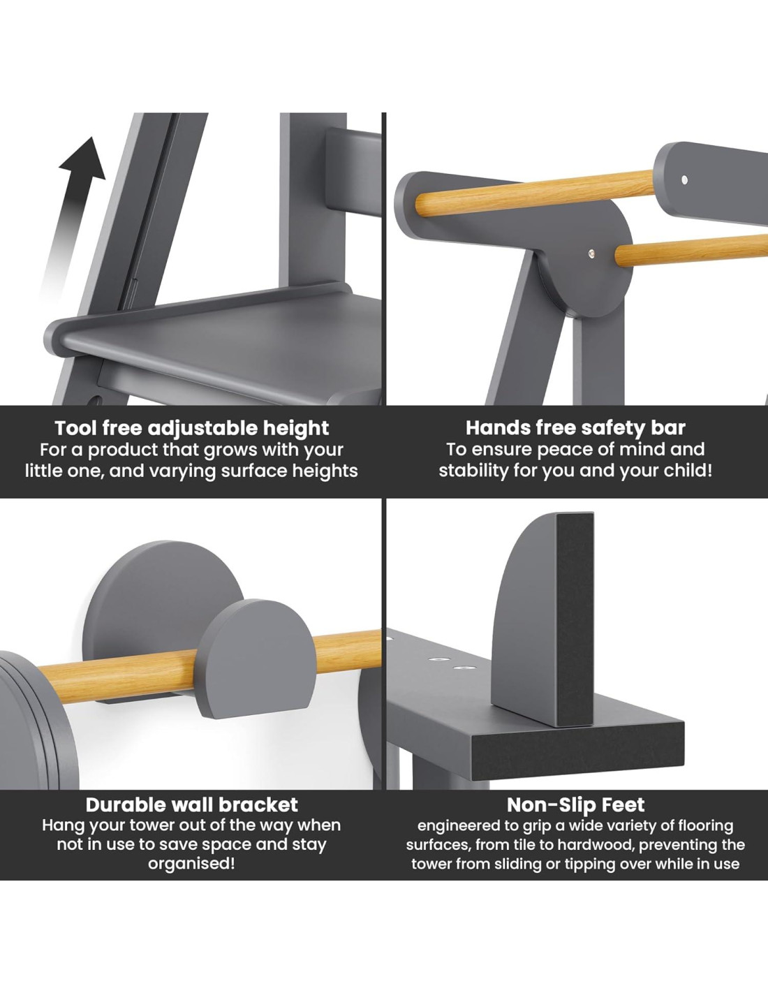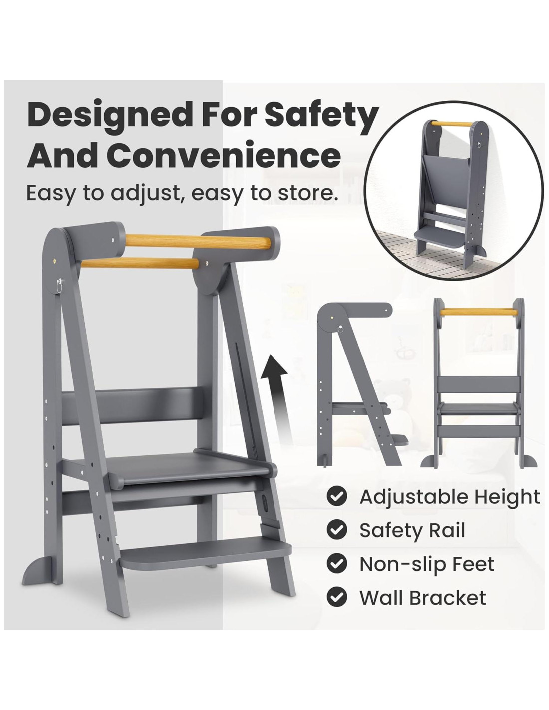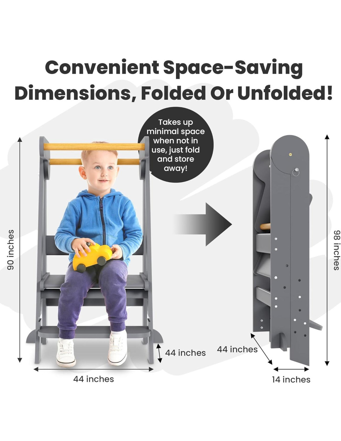 - AYUDA A TU NIÑO PEQUEÑO A PROSPERAR con nuestra Torre de Pie Plegable para Niños Pequeños. Coloca la torre de cocina para niños en un lugar conveniente, asegúrala con el soporte de pared y baja el riel de seguridad para mantener a tu niño seguro y alentarlo a participar en actividades familiares