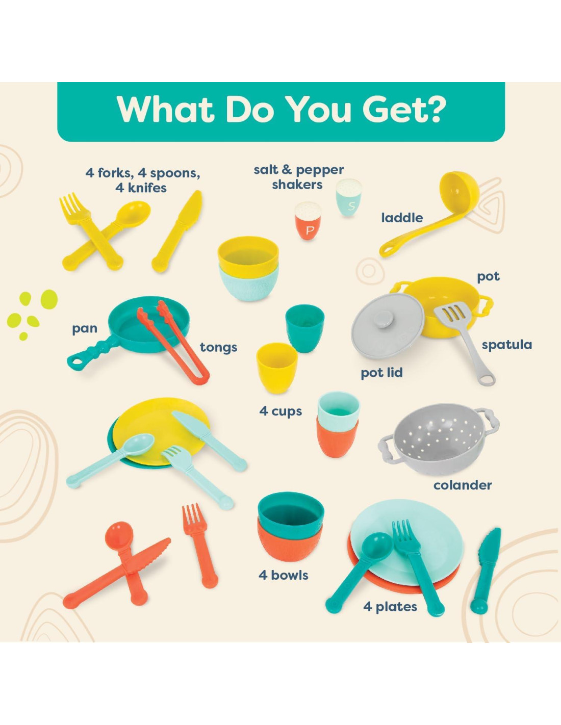 ¡Juega, cocina, crea y pon diversión en un plato con el Set de Cocina Mini Chef de B. toys! Este set de juego viene con todo lo que los pequeños chefs necesitan para cocinar un brunch, almuerzo o simplemente un bocadillo imaginario. Los niños pueden preparar sus platos de fantasía usando los coloridos utensilios y ollas, y luego poner la mesa para 4 con los platos, tazones, tazas y cubiertos (los amigos de peluche están invitados a cenar, por supuesto!). Todos los accesorios son resistentes, amigables para manos pequeñas y están hechos para horas y horas de juego creativo de imaginación. Y los padres también estarán felices de saber que pueden cocinar un mañana más brillante reciclando fácilmente el empaque. Recomendado para niños de 3 años en adelante.
