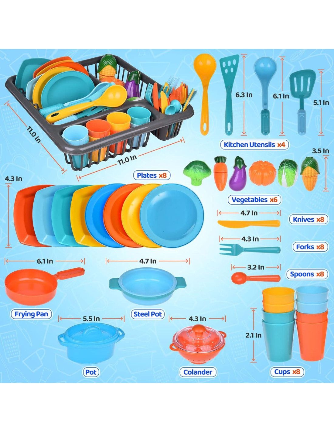 - Super Valor: El set de accesorios de cocina de juguete de 54 piezas incluye un escurridor de platos, platos, tazas, ollas y sartenes, herramientas de cocina, cubiertos (tenedores, cuchillos y cucharas) y verduras para cortar; todo está listo para que un pequeño chef prepare un banquete imaginario en casa. Juguetes de regalos de Navidad, juguetes para niños pequeños, juguetes para niños, juguetes para niños y juguetes para niñas.