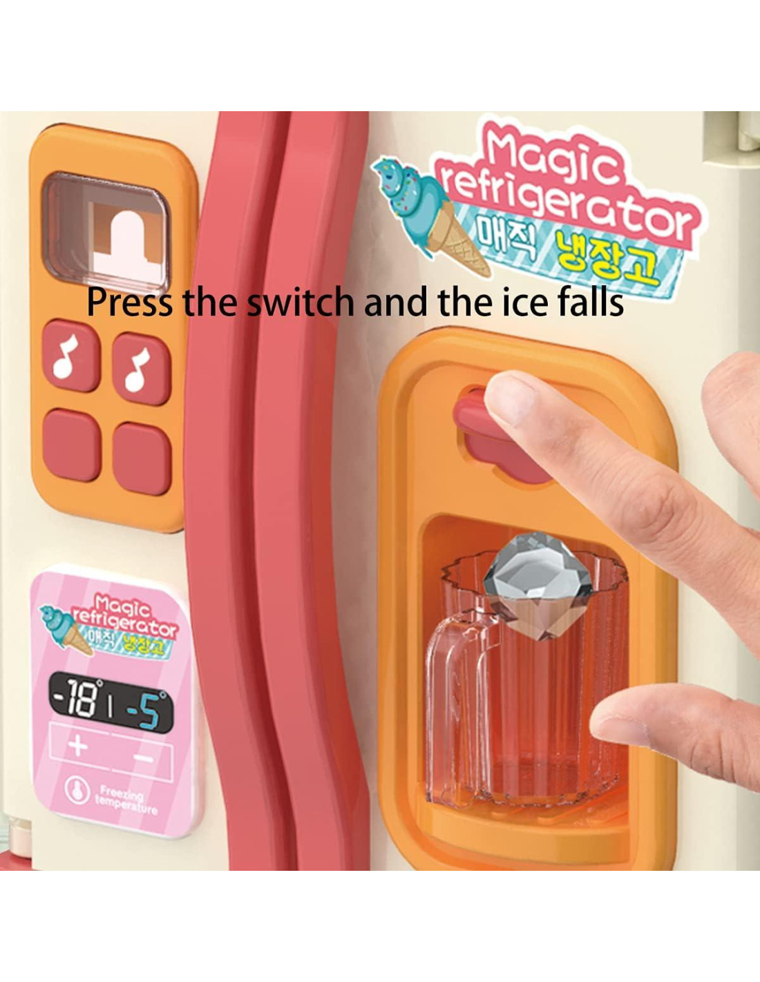 Refrigerador de juguete de cocina para niños, el refrigerador con música de iluminación y otros efectos simulados de refrigerador, distribución de una variedad de alimentos simulados, es propicio para mejorar la capacidad cognitiva del bebé, a través de la limpieza del refrigerador para mejorar la habilidad práctica. Llene la pequeña botella con agua en el pequeño agujero en la parte superior del refrigerador de juguete. Espere 3 segundos para abrir el refrigerador de juguete. Tiene un efecto de spray. Agregue cubitos de hielo de juguete dentro de la puerta del refrigerador de juguete. Coloque la taza, presione el interruptor en la puerta del refrigerador de juguete y vierta cualquier cubito de hielo.