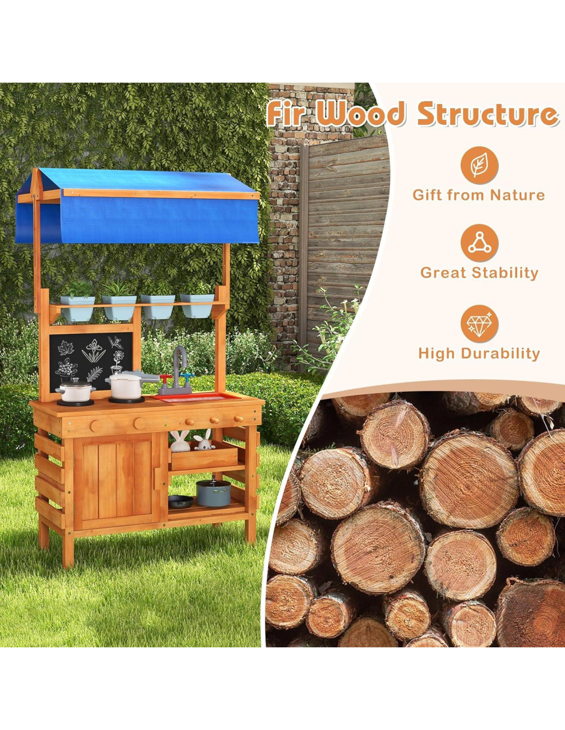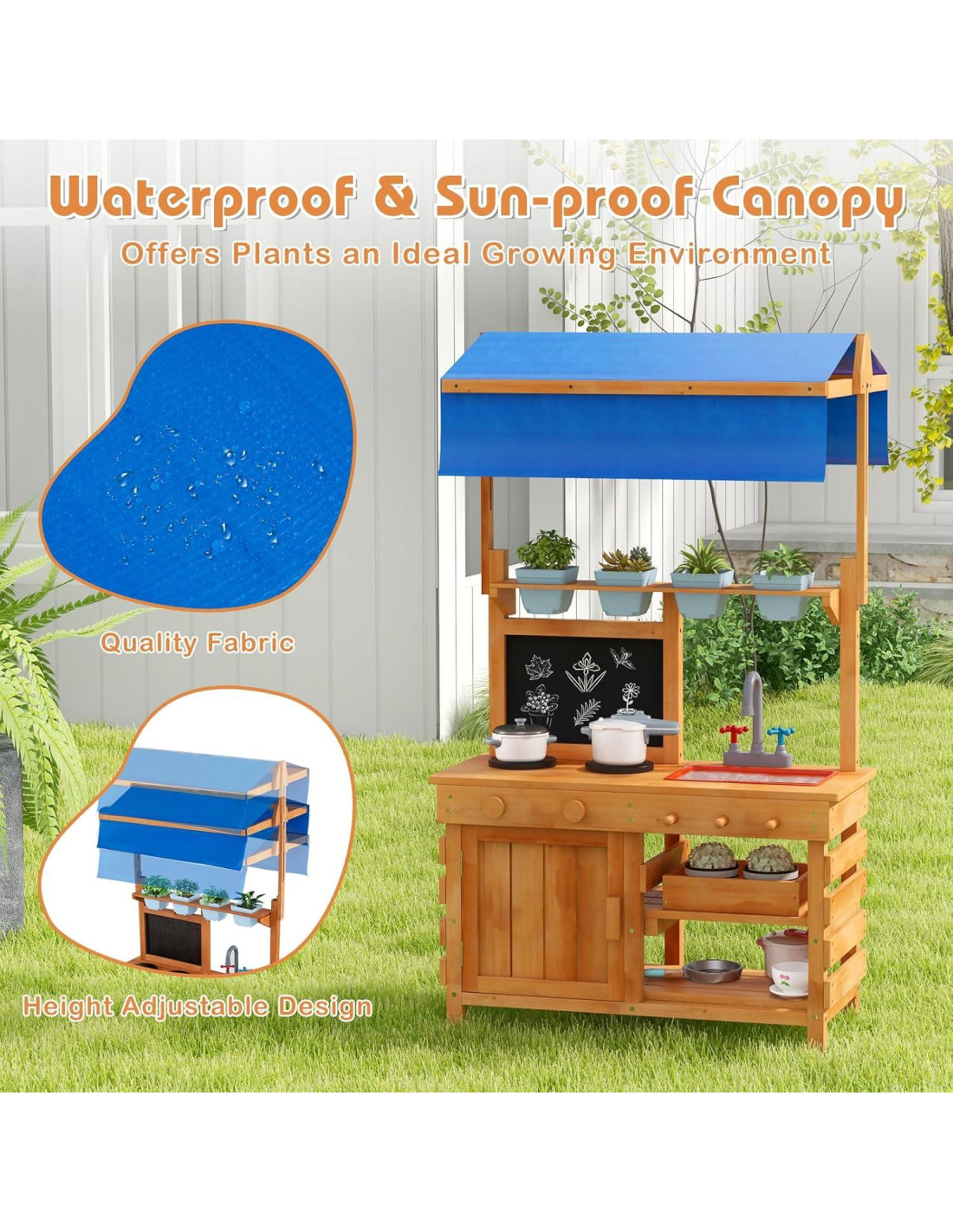 - Toldito Ajustable en Altura: Hecho de tela de alta calidad, el toldito superior es resistente al agua y al sol, y ofrece a las plantas un ambiente ideal para crecer y un área de juego fresca para los niños. Además, el diseño ajustable en altura hace que la cocina de juego al aire libre se adapte a las diferentes etapas de crecimiento de los niños.