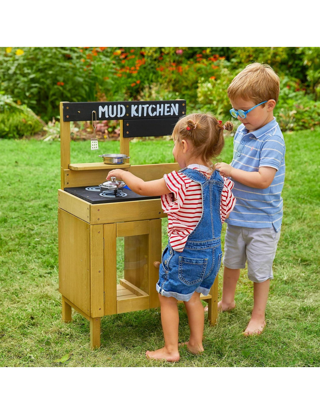 - ¡Accesorios incluidos! La cocina de barro de madera TP Junior Cook incluye un juego inicial de sartenes y utensilios de acero inoxidable.
