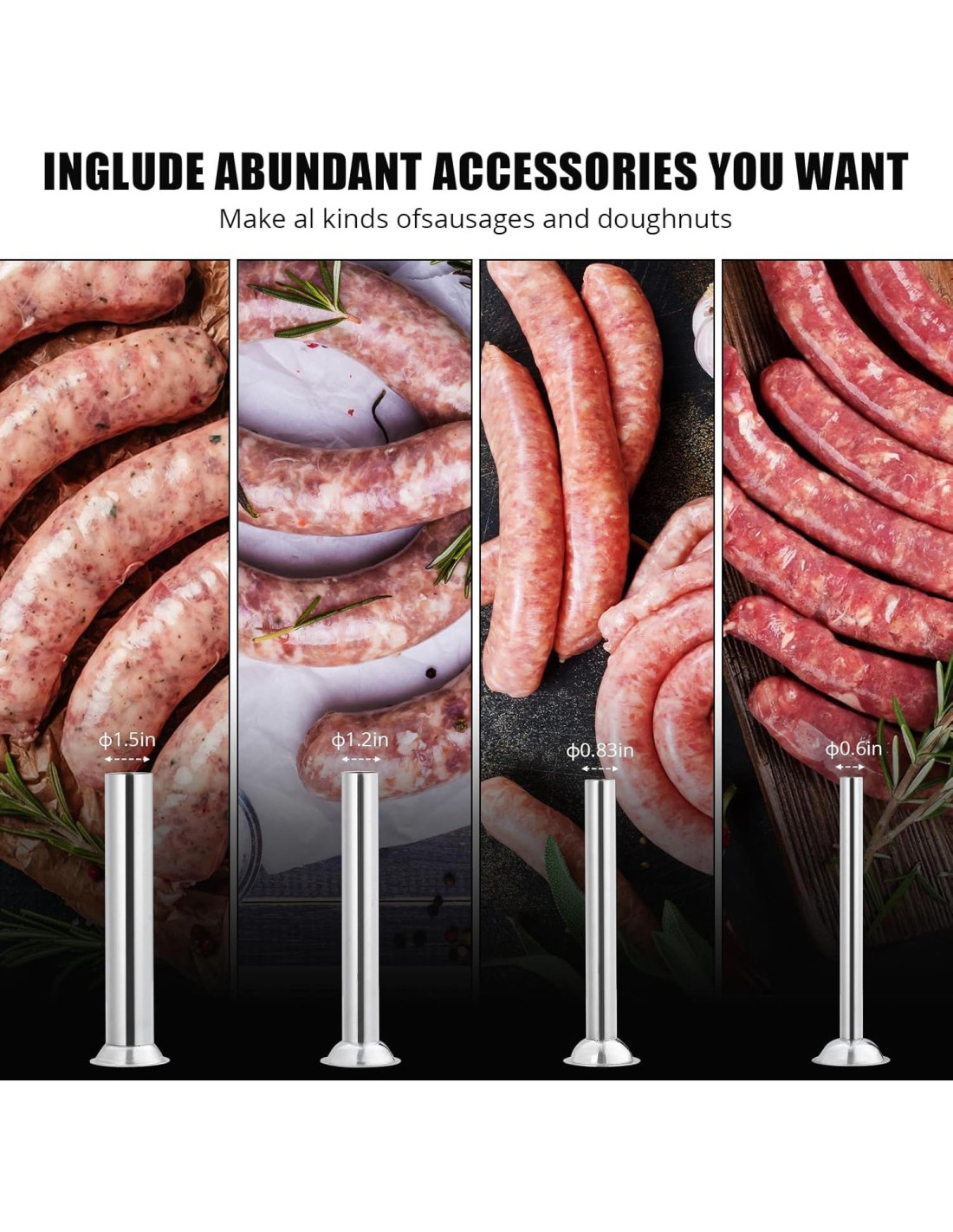 - - Tubos de Relleno Versátiles: Equipado con múltiples tubos de relleno de acero inoxidable (Diámetro Interno: 14mm, 20mm, 30mm, 36mm; Diámetro Externo: 16mm, 22mm, 32mm, 38mm), esta herramienta de relleno de salchichas se adapta a varios tipos de salchichas, desde pepperoni delgado hasta salami robusto. Además, incluye un accesorio para churros para mayor versatilidad en la cocina.