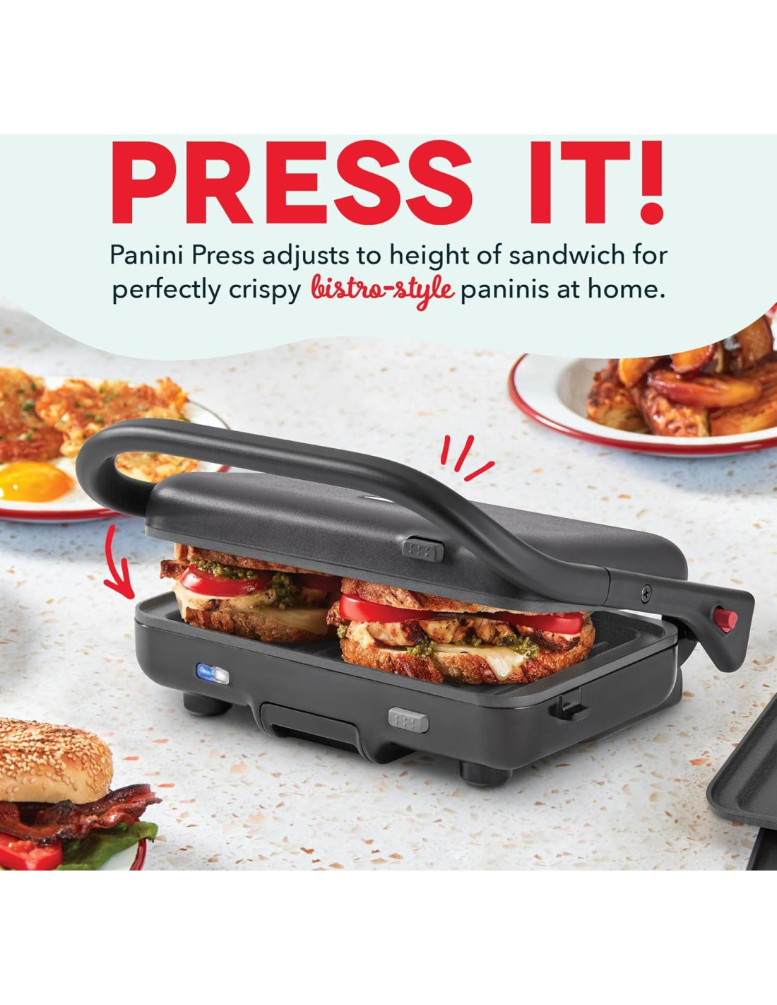 Flexiona tus habilidades culinarias en desayuno, almuerzo y cena con este sistema de cocina todo en uno para encimera. Cambia fácilmente entre las Placas Removibles de Waffle y Grill incluidas para una cocina conveniente de encimera desde el amanecer hasta el anochecer. Las Placas de Waffle preparan el desayuno rápidamente mientras que las Placas de Grill sirven almuerzo y cena en un instante. Mantenlo cerrado para asar hamburguesas y pechugas de pollo o ábrelo a 180 para asar a la plancha en interiores directamente en tu encimera, ¡genial para tocino, salchichas, fajitas y más! El sistema también funciona como una prensa de panini estilo bistró completa con funcionalidad de tapa articulada que mantiene el pan crujiente mientras presiona. Los estilos de vida en movimiento amarán lo rápido y fácil que es la preparación de comidas, ¡y más saludable también! Usa el Grill para presionar proteínas y liberar grasa, y la bandeja de goteo incluida canalizará la grasa para opciones de asado más saludables. Este pequeño potente puede sentarse directamente en tu encimera para cocinar todos los días, preparando comidas calientes sin estufa, lo que lo hace ideal para espacios pequeños como apartamentos, dormitorios y casas rodantes. Cuando termines de cocinar, las Placas Removibles se desprenden sin esfuerzo del Grill y van directamente al lavavajillas para una limpieza sin desorden. ¿Buscas un flex aún mayor? ¡Las Placas de Plancha compatibles también están disponibles para aún más delicias fáciles todos los días en un instante!