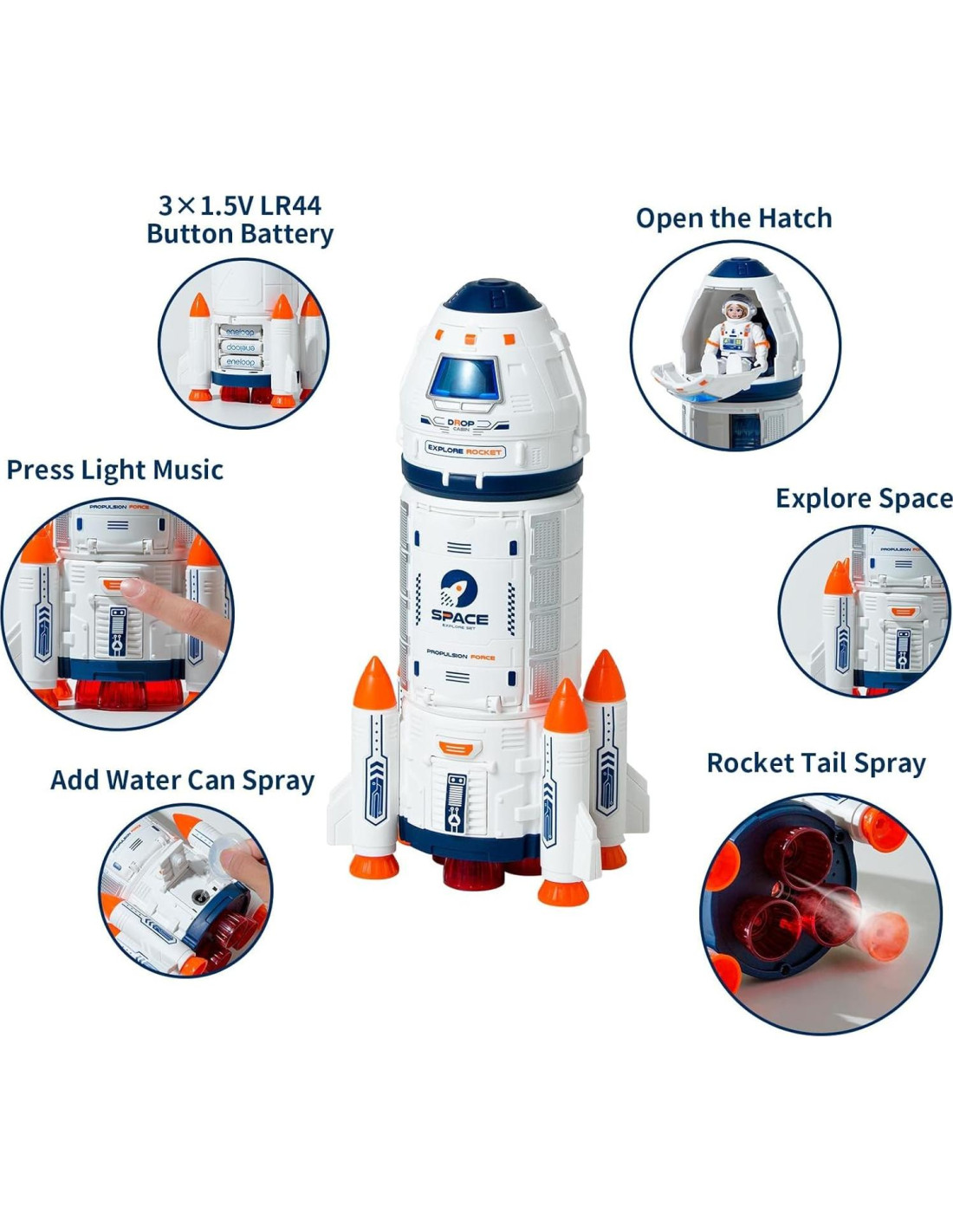 - Diseño y materiales de producto premium - Este juguete de cohete espacial está hecho de material ABS de alta calidad, con características resistentes a caídas, anti-desgaste, duraderas, puede soportar un uso prolongado y un juego frecuente, y es seguro para los niños. El cohete espacial contiene, 1 cápsula de retorno espacial, 2 astronautas, 1 scooter, 1 disco, 1 brazo telescópico, 1 llenador de agua