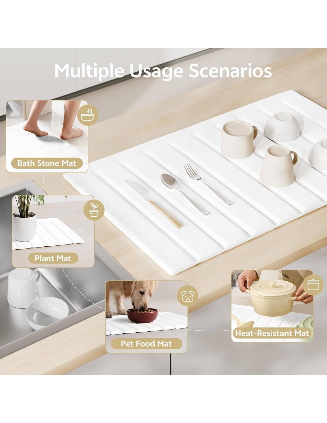 - [Diseño Plegable que Ahorra Espacio] - Cuando está desplegada, la alfombrilla de platos enrollable mide 25" (63.5 cm) x 16" (40.6 cm), más grande que la mayoría de las alfombrillas de secado de tierra diatomácea estándar. Cuando no la necesites, simplemente pliégala y guárdala en cajones o armarios de cocina