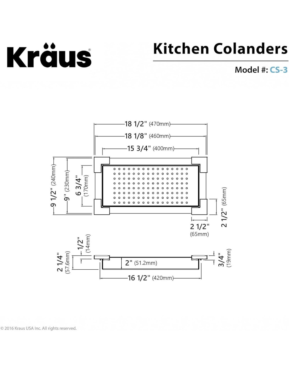 Descripción del Producto Diseñado con líneas limpias y formas elegantes, los accesorios de cocina Kraus proporcionan eficiencia diaria con estilo. Este colador está construido de acero inoxidable sólido para máxima durabilidad. El acabado de grado comercial coordina maravillosamente con la mayoría de los electrodomésticos y grifos de cocina populares. Con características de seguridad como una superficie que se mantiene fría y cojines protectores, el colador ofrece funcionalidad flexible para una variedad de tareas. Experimenta la Calidad Kraus, hasta en los detalles. Del Fabricante El Colador Kraus es una adición ideal a tu fregadero de cocina. El colador cuenta con construcción de acero inoxidable T-304. Acabado premium de satén de grado comercial resistente a rayones. El colador se desliza sobre la encimera y está soportado por cojines protectores. Diseñado para instalación bajo encimera. Úsalo para lavar o escurrir frutas y verduras. Fabricado por Kraus Garantía limitada de por vida del fabricante. Tamaños exteriores: 18.5 pulgadas (47 cm) L x 9.3 pulgadas (23.6 cm) W x 2 pulgadas (5.1 cm) D Tamaños interiores: 16 pulgadas (40.6 cm) L x 6.8 pulgadas (17.3 cm) W x 2 pulgadas (5.1 cm) D Compatible con KHU100-32, KHU102-33 (ambos tazones), KHU103-33 (ambos tazones), KHU121-23, KBU22 (ambos tazones), KBU21 (tazón grande).