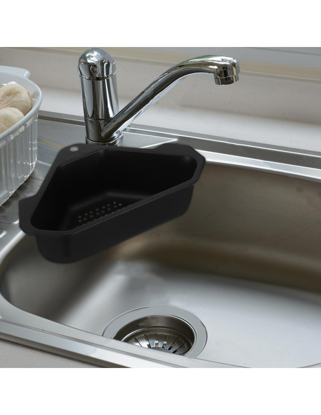 - Drenaje Eficiente: Este desecho de fregadero triangular de acero inoxidable cuenta con un diseño de doble propósito, permitiéndote no solo almacenar tus utensilios de cocina, sino también drenar los desechos de cocina. Su superficie fácil de limpiar y rápido drenaje de agua aseguran vajilla seca