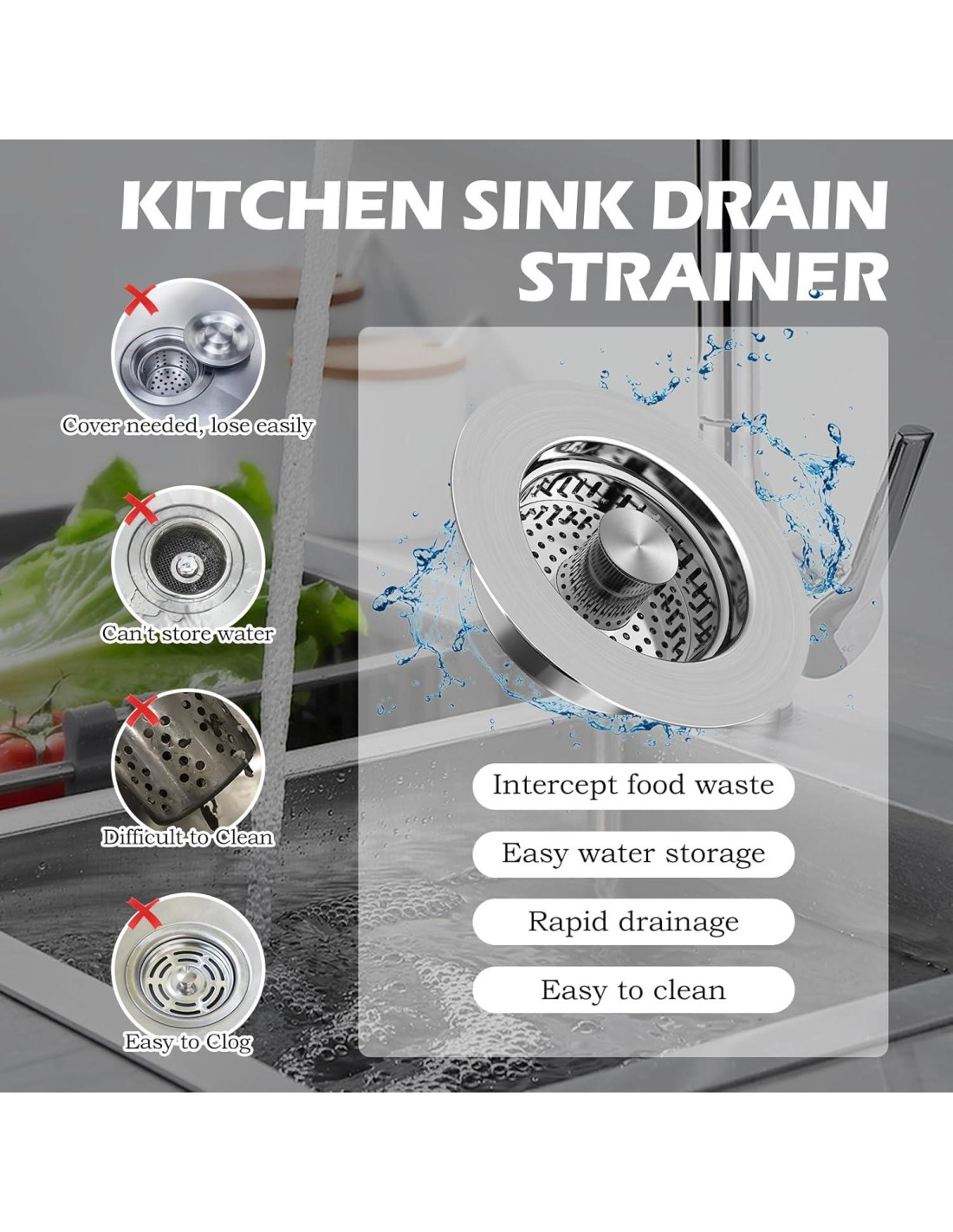 - COLADOR DE DESAGÜE DE FREGADERO 3 EN 1: El tapón de fregadero combina funciones de almacenamiento de agua, filtración y aislamiento de olores. Se puede usar para llenar el fregadero con agua para limpiar y remojar. La canasta perforada puede filtrar fácilmente los desechos de cocina sin bloquear el flujo de agua, y puede capturar fácilmente alimentos, basura y escombros para prevenir obstrucciones en las tuberías de la cocina
