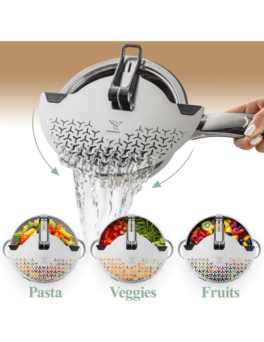 - EXPERIMENTA LA PRECISIÓN SUIZA EN CADA COMIDA. Optimiza tu cocina con este colador de pasta compacto Verreaux Suizo diseñado para un almacenamiento eficiente. Este colador de pasta compacto ocupa un espacio mínimo en comparación con los coladores de acero inoxidable tradicionales. Ya sea para pasta o verduras, este colador de metal para olla es perfecto para cocinas pequeñas y reduce el desorden mientras asegura un drenaje sin esfuerzo.