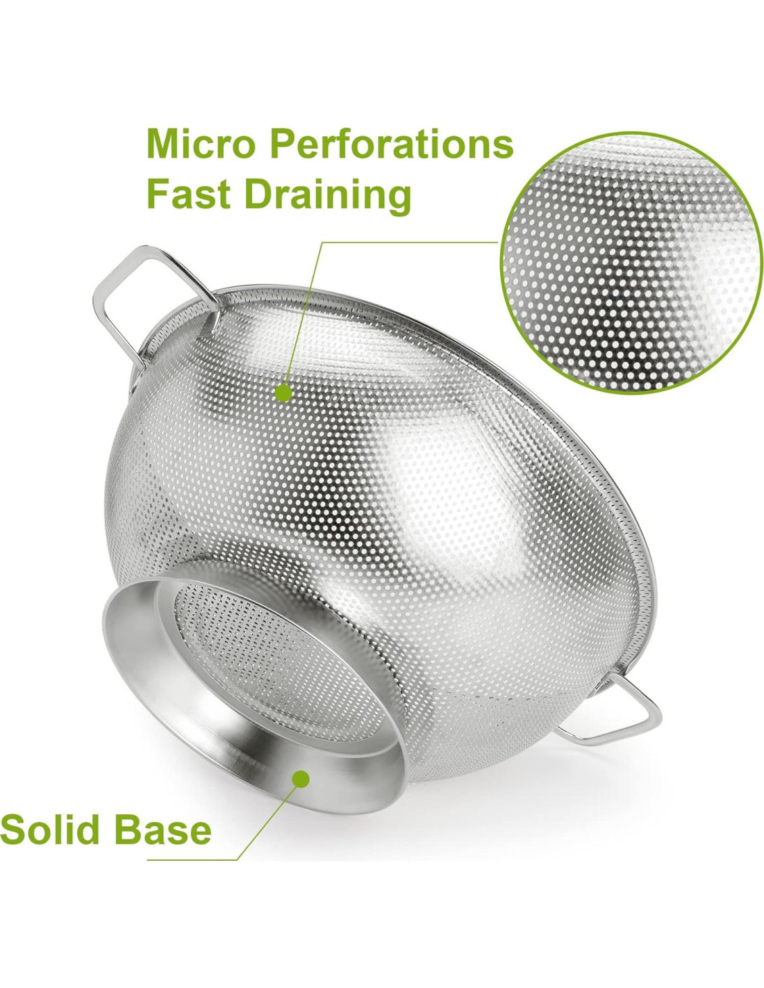 Los agujeros pequeños y estrechamente espaciados significan que tu comida drena rápido, la malla es resistente y no se deformará, estirará ni enganchará incluso bajo alimentos pesados (en particular, el arroz y los espaguetis no caerán a través de los agujeros); Diseño de doble asa en ambos lados, conveniente para la extracción, fácil de manejar, soldadura firme, no es fácil que se caiga, capaz de soportar más peso. El diseño con patas facilita el drenaje rápido y fácil, la base sólida y resistente mantiene el colador en posición vertical. Hecho de acero inoxidable 18/10 de grado profesional, es resistente a la oxidación y nunca afectará el sabor de tu comida.