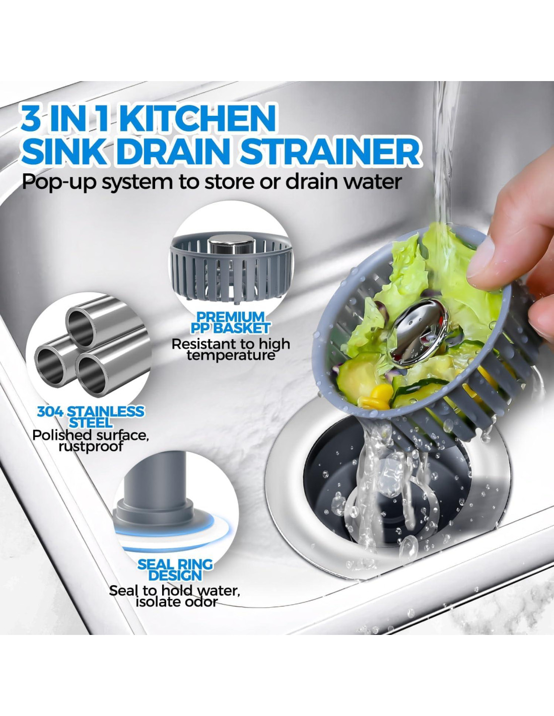 - Colador de desagüe de fregadero de cocina 3 en 1 mejorado. Nuestro colador de fregadero de cocina combina colador de desagüe de fregadero, tapón de fregadero de cocina y aislamiento de olores. Presione el botón emergente para almacenar agua para lavar, presione nuevamente para drenar agua mientras atrapa desechos de comida o restos que van por el desagüe. Un confiable ayudante anti-obstrucción y una pieza imprescindible para la instalación del fregadero de cocina