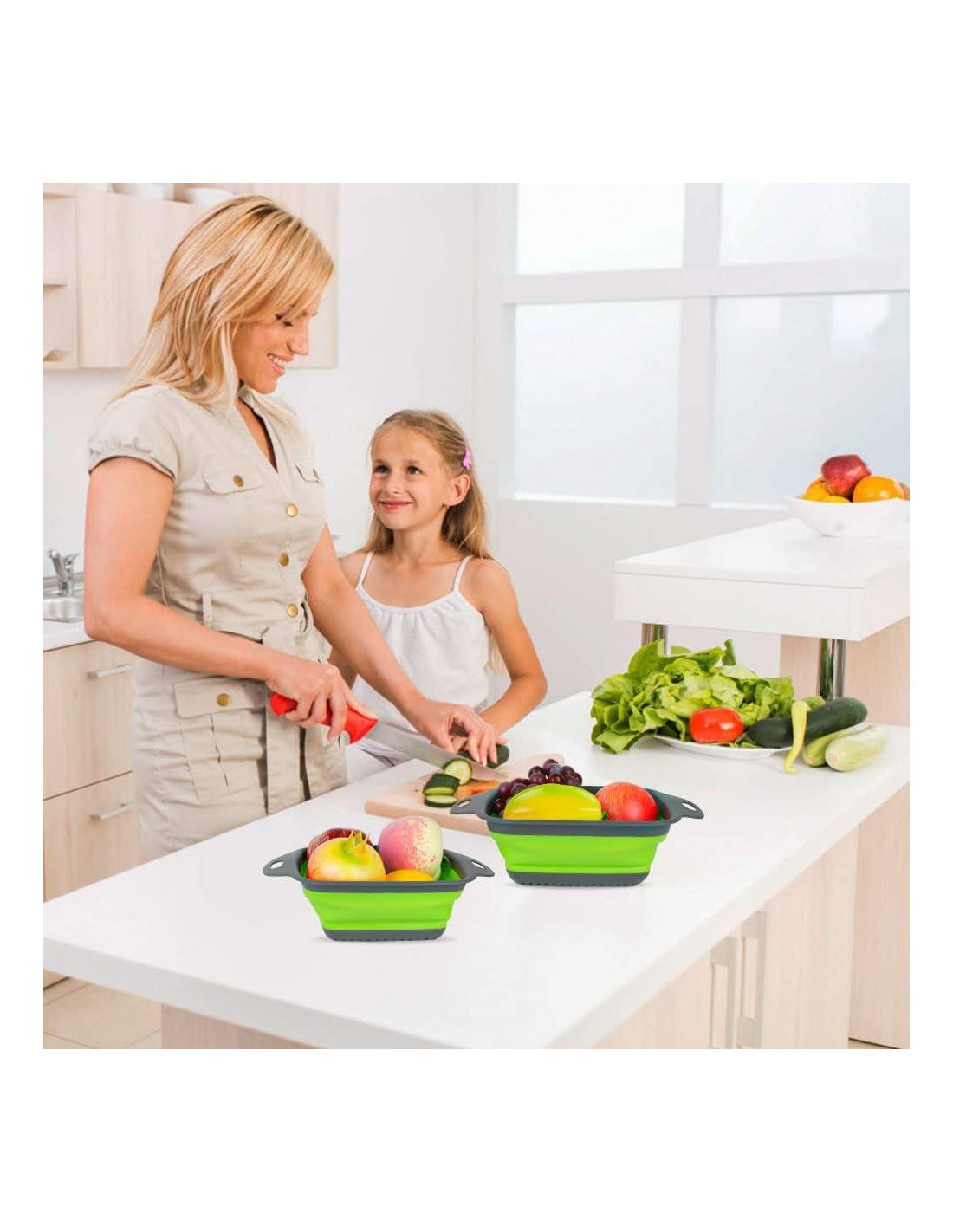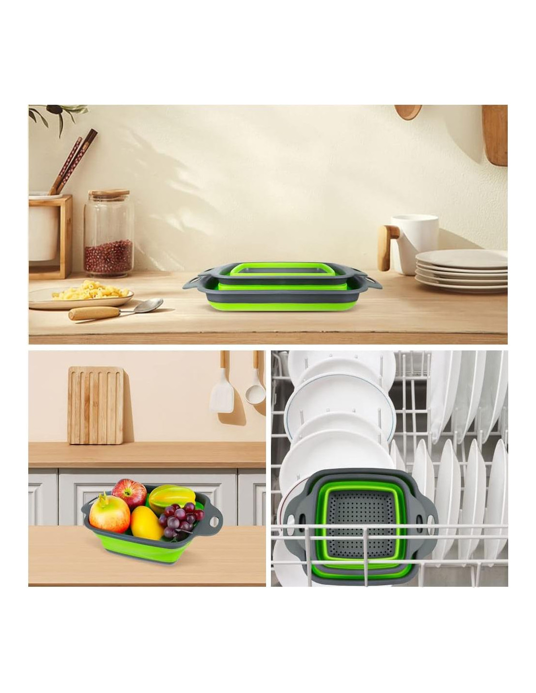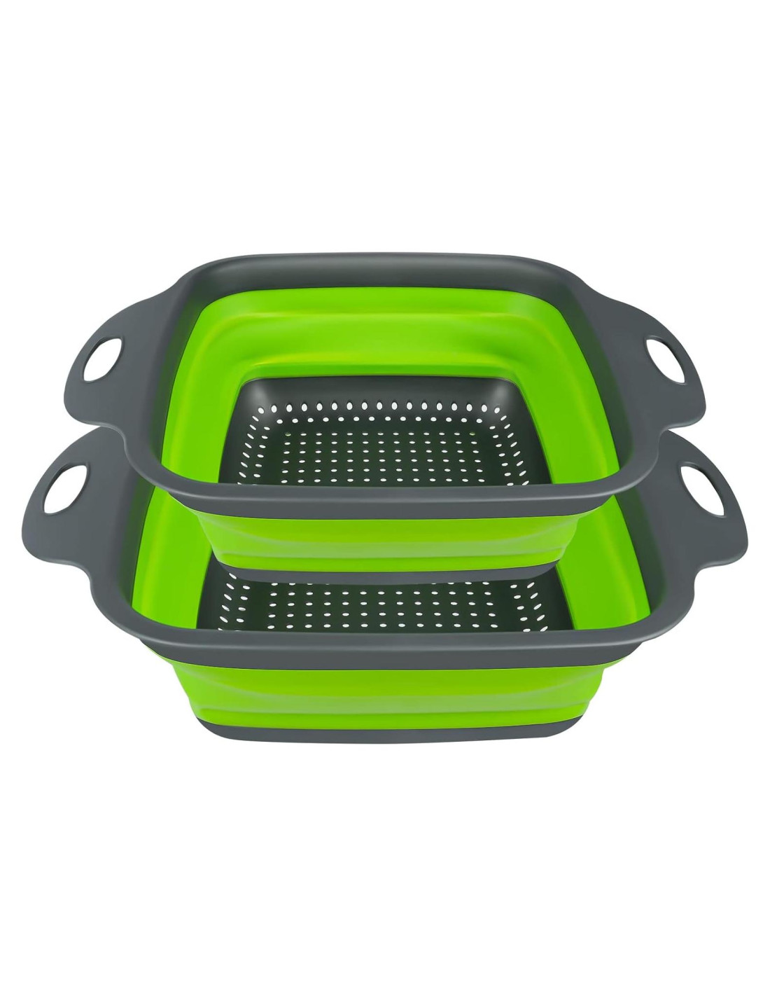 - DISEÑO MEJORADO: El diseño de agujeros en la parte inferior permite un fácil enjuague y drenaje al lavar frutas, drenar verduras y pasta, y evita que los alimentos caigan en el desagüe. Áreas de silicona más pequeñas mejoran la retención de forma. Más agujeros, drenaje más rápido. Material de alta calidad y más grueso para mayor durabilidad. Mangos de plástico con bordes reforzados proporcionan a los usuarios un agarre cómodo.
