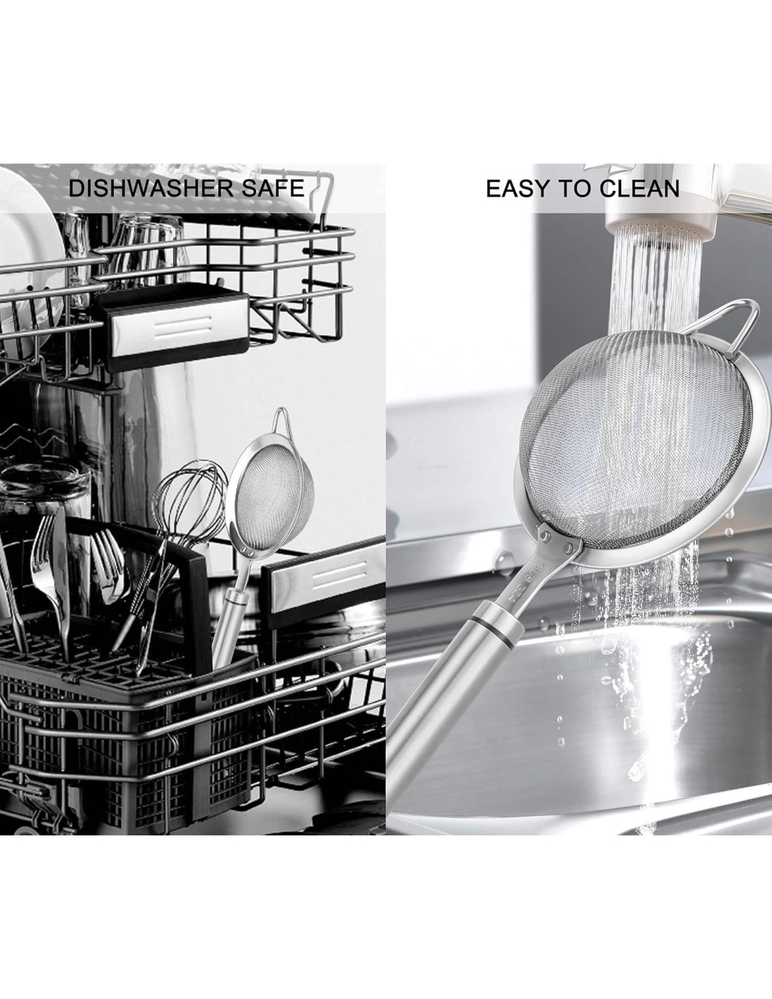 - Hecho de acero inoxidable 304 de alta calidad y apto para alimentos. Este colador cuenta con un marco exterior resistente y mango. Fácil de limpiar. Apto para lavavajillas. La malla de alambre pulido y sin rebabas no raspará tu mano mientras lo limpias.