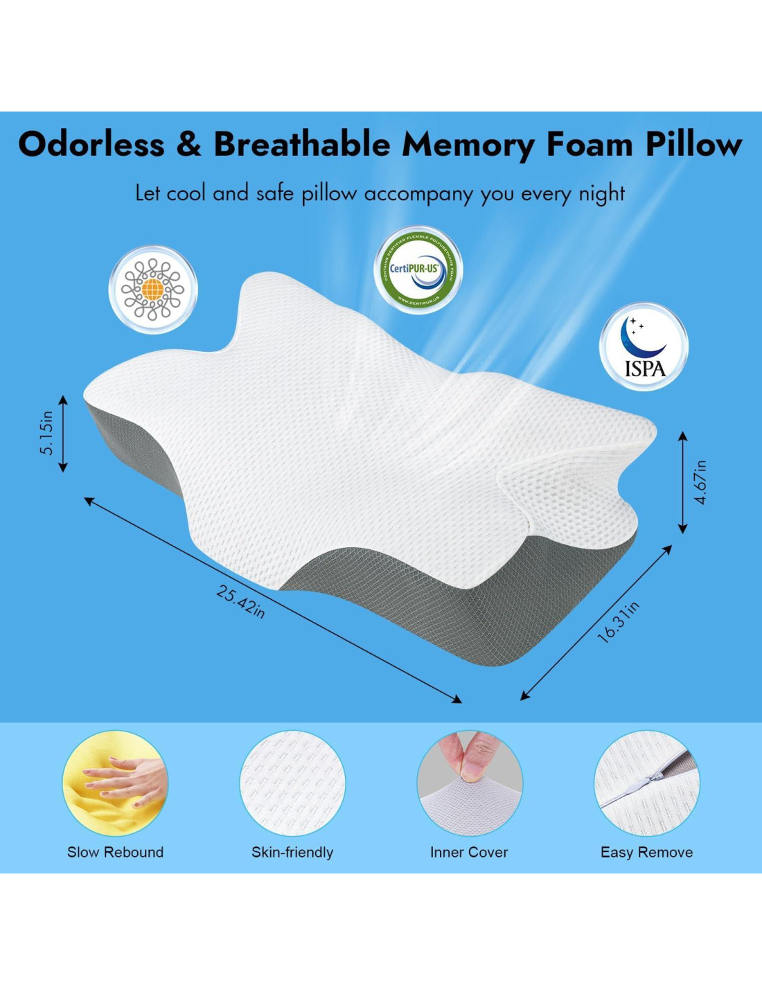 - Alivio del Dolor de Cuello. Nuestros cojines de espuma viscoelástica cuentan con tecnología avanzada que alivia la presión en tu cuello y hombros, ayudándote a relajarte y desconectar para un sueño verdaderamente restaurador. Tendrás más sueño profundo por la noche y te encontrarás durmiendo más rápido, durmiendo más tiempo y despertando sintiéndote revitalizado sin dolores y molestias matutinas.
