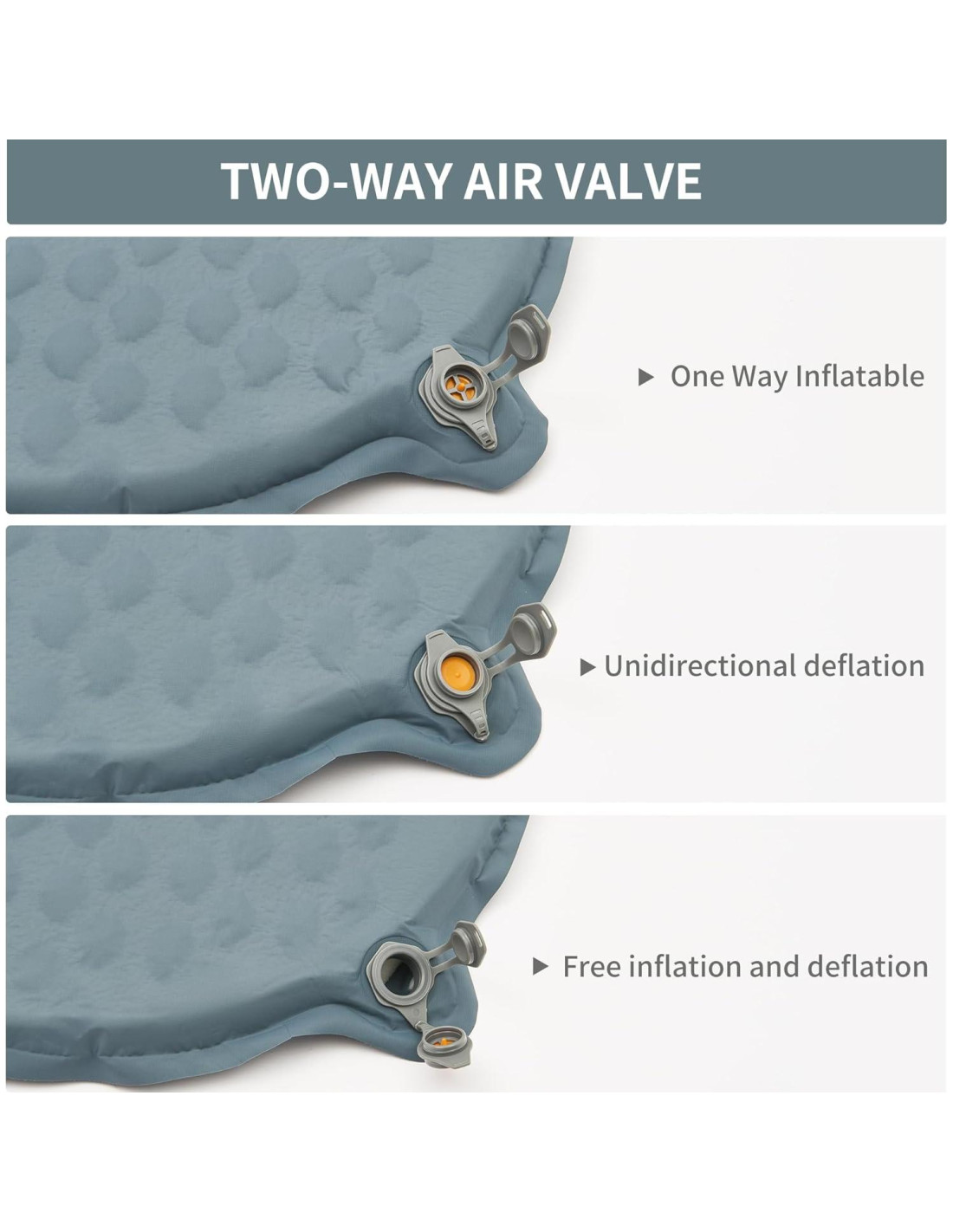- [VÁLVULA DE INFLADO BIDIRECCIONAL] Un lado se infla y el otro se desinfla, giro libre para cambiar de modo. Nota: Autoinflar y luego reponer el cojín de aire con la boca puede hacer que el cojín de aire sea más duro y firme
