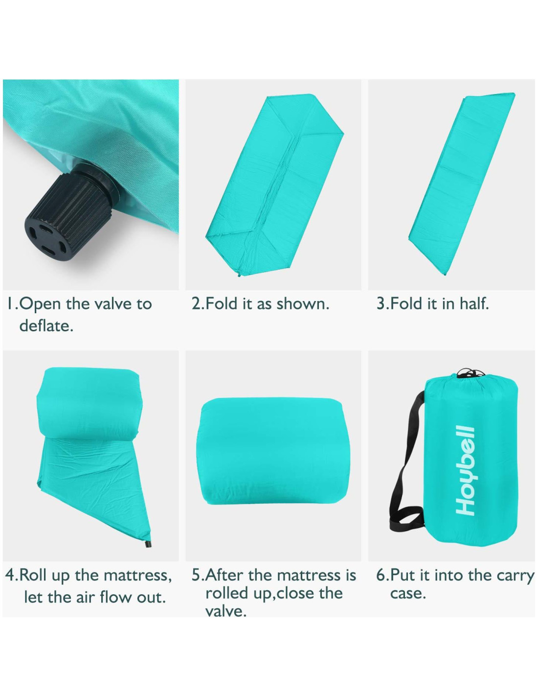 - Diseño autoinflable: la válvula de flujo libre infla la alfombra sin necesidad de bomba de aire.