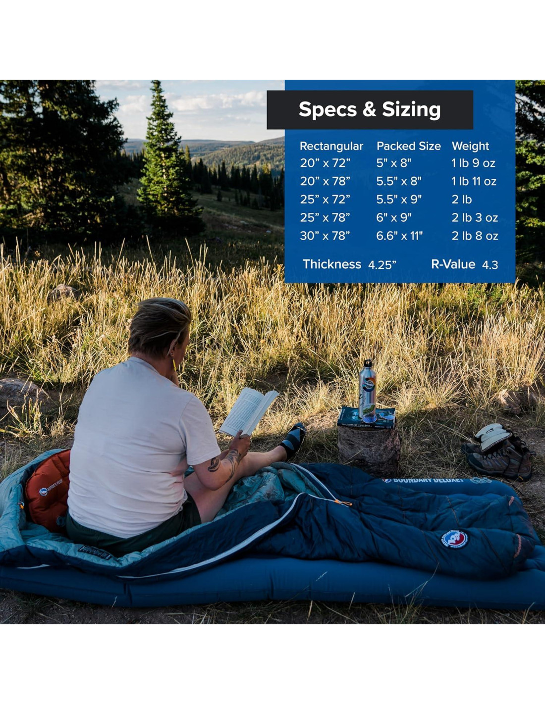 - GARANTÍA DE POR VIDA - Todas las almohadillas Big Agnes son infladas y probadas individualmente en nuestra fábrica asegurando un rendimiento de calidad del 100%. Todos los productos Big Agnes están garantizados contra defectos de fabricación o de material. La almohadilla regular de 51x183 cm pesa solo 710 g y se pliega a 12.7 cm x 20.3 cm.