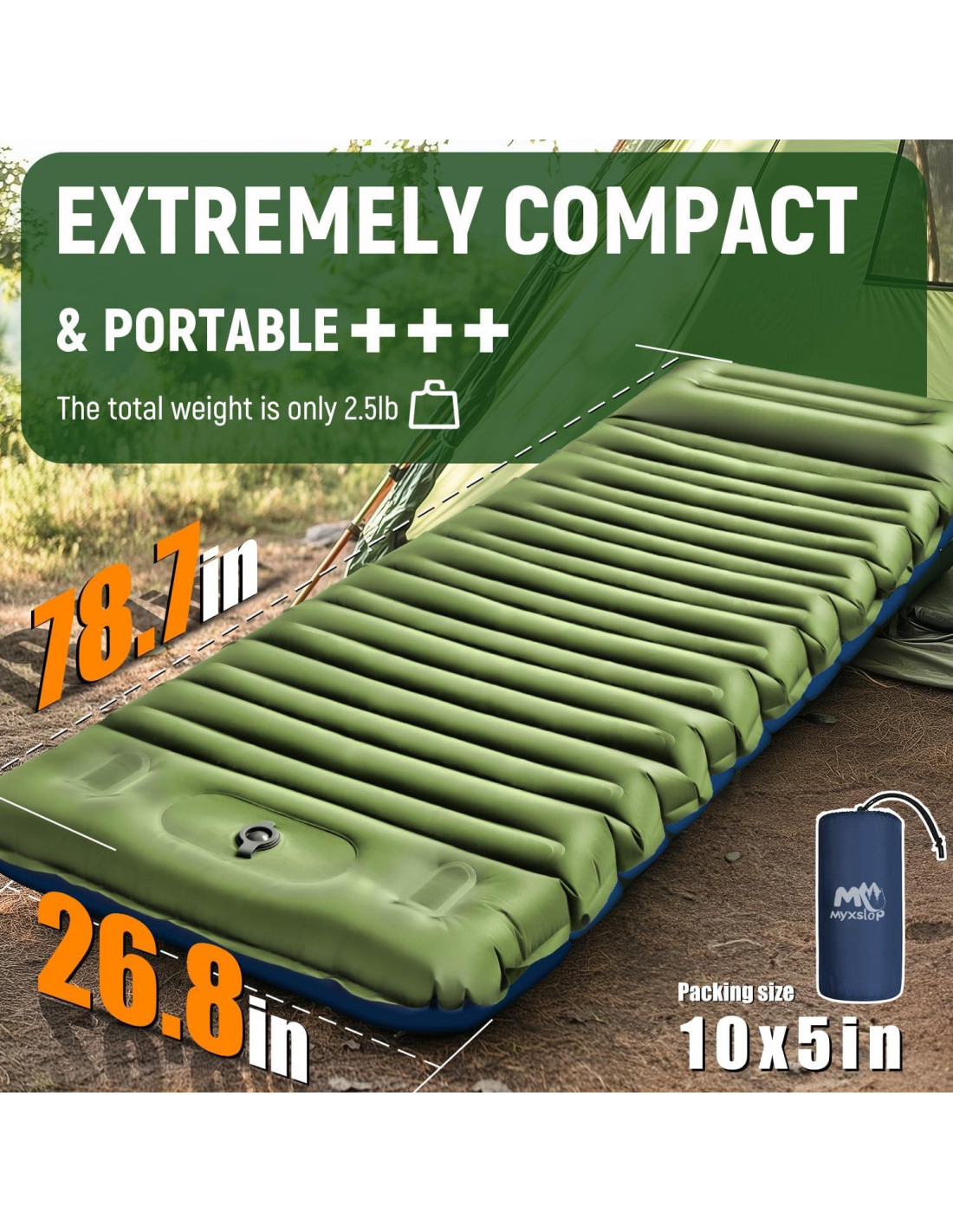 - [Colchoneta de Camping Extra Ancha y Gruesa de 5"] La colchoneta de camping Myxslop mide hasta 79*27*5 pulgadas, una vez inflada, el cuerpo puede alejarse del suelo irregular y las rocas duras. Diseño ergonómico de tubo de aire estriado innovador para aliviar la presión en la espalda y el cuello, permitiéndote ajustar libremente tu equilibrio y comodidad, disfrutando de una noche completa de sueño cómodo en cualquier posición para dormir.