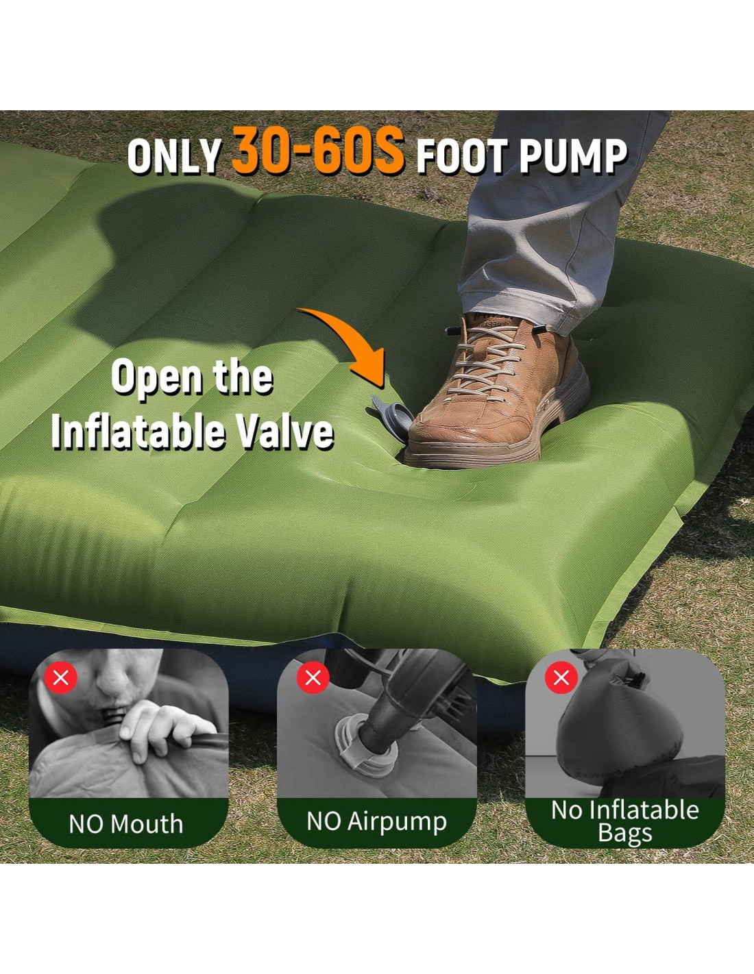 - [Solo 30s para Inflar y 1s para Desinflar] La colchoneta para camping tiene una bomba de pie integrada que se puede inflar completamente con presión del pie en solo 30-60s, la colchoneta autoinflable es conveniente y fácil, ya no necesitas inflar con la boca, las manos o llevar una bomba, y solo toma 1 segundo para desinflar rápidamente. Versión mejorada de la válvula de liberación de aire sin película de fuga, ¡nunca te preocupes por fugas de aire!
