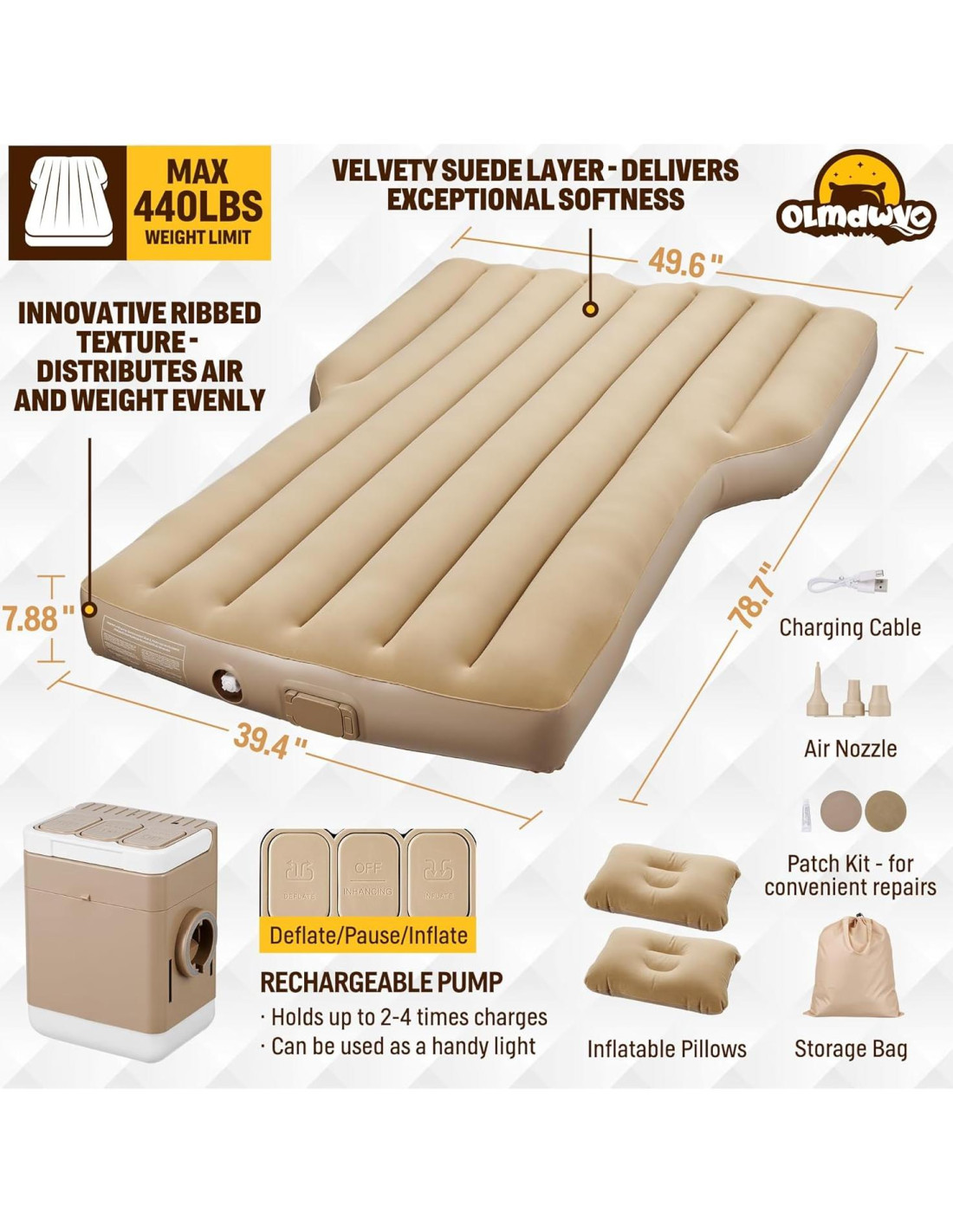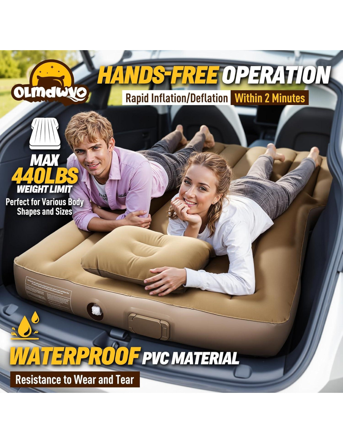 Característica Superficie de Suede Aterciopelado Con una lujosa capa de suede, el colchón de aire Model Y ofrece una suavidad excepcional junto con una impresionante resistencia. Textura Ribeteada Innovadora El colchón incorpora una distintiva textura ribeteada para prevenir el movimiento mientras duermes, y sus materiales impermeables y duraderos están diseñados para un rendimiento duradero. Inflado/Desinflado Rápido en 2 Minutos Con su bomba de aire recargable y desmontable, este colchón se infla o desinfla en un rápido tiempo de 2 minutos con solo presionar un botón. Su operación manos libres simplifica la configuración, y la bomba convenientemente también funciona como una luz. Comodidad Personalizada El colchón de aire Model Y cuenta con comodidad totalmente ajustable, lo que facilita inflar o desinflar para alcanzar tu firmeza ideal sin esfuerzo. Grosor de 20cm El grosor proporciona una comodidad superior, mejor aislamiento, durabilidad inigualable y mejor distribución del peso. Kit de Parche Adicional El colchón viene con un kit de parches para reparaciones convenientes, asegurando que rasguños menores no afecten su rendimiento. Límite de Peso Máx 200kg Diseñado para acomodar un límite de peso de 200 kg, este colchón de coche es perfecto para diversas formas y tamaños de cuerpo. Construcción Interna Inteligente El innovador diseño interno distribuye uniformemente el aire y el peso, ofreciendo un excepcional alivio de presión y asegurando la máxima comodidad durante tu sueño. Versátil para Cada Ocasión Más que un complemento para tu Model Y, este colchón de aire portátil es perfecto para una variedad de actividades, incluyendo viajes a la playa, picnics en el parque y noches acogedoras en interiores. Diseño Plegable Conveniente Sus dimensiones plegables convenientes (38cm x 15cm x 30cm) facilitan el almacenamiento, asegurando que siempre estés listo para un sueño cómodo y aislado. Dos Almohadas Inflables Tiene dos almohadas inflables, que proporcionan soporte para la cabeza y el cuello, haciéndolo ideal para dormir durante viajes en coche. Garantía Ofrecemos una garantía de fábrica de 3 años. Llámanos o envíanos un mensaje, sabrás lo fácil que es para los clientes resolver sus problemas.