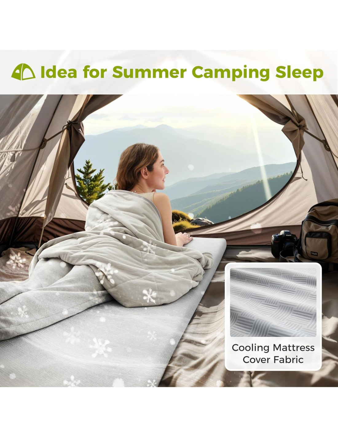 - Refrigeración Instantánea: La funda del colchón de camping presenta tecnología de tela refrigerante especializada que ayuda a regular la temperatura para un sueño nocturno más cómodo al aire libre, adecuada para noches calurosas de verano.