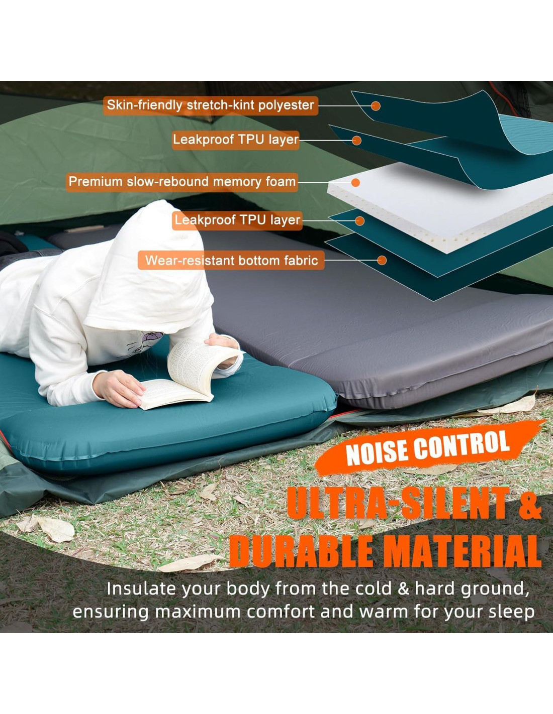 - La colchoneta autoinflable está hecha de tela de punto elástico de grado exterior 50D recubierta con una capa de TPU a prueba de fugas, proporcionando excelente transpirabilidad, aislamiento térmico y resistencia al desgarro, asegurando la máxima comodidad y calidez para tu sueño. Con una superficie suave y amigable con la piel, el colchón de camping produce el menor ruido durante el sueño, proporcionando un ambiente de sueño tranquilo y pacífico para ti y tu pareja, tu colchoneta de camping cómoda para usar en tienda, saco de dormir o cualquier tipo de aventura.