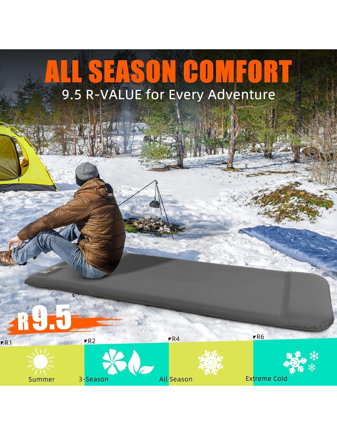 - La colchoneta aislante tiene un valor R de 9.5, ofreciendo propiedades de aislamiento excepcionales para asegurarte de que te mantengas caliente incluso en entornos fríos. El colchón de espuma de 2.67 kg asegura comodidad y un aislamiento adecuado en varios entornos al aire libre. Ya sea que estés planeando un viaje de camping en invierno o una acogedora aventura en otoño, nuestra colchoneta de camping autoinflable proporciona a tu familia y a ti una experiencia de sueño consistentemente cómoda durante todo el año.