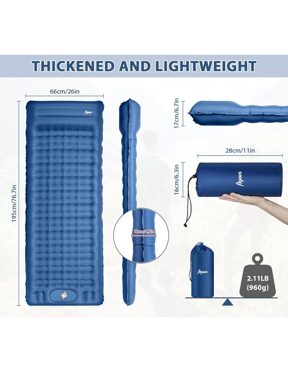 - Colchón de Camping Más Suave y Compacto: La colchoneta de dormir compacta y ligera de Agoer está hecha de nylon 40D y recubrimiento de sellado TPU interno, ¡suave y amigable con la piel! El ruido es menor que el de otras colchonetas de camping en el mercado. Nuestro colchón de aire compacto para camping no solo es impermeable y resistente al desgaste, sino también fácil de limpiar. La capacidad de carga máxima de la colchoneta de dormir es de 200 kg.