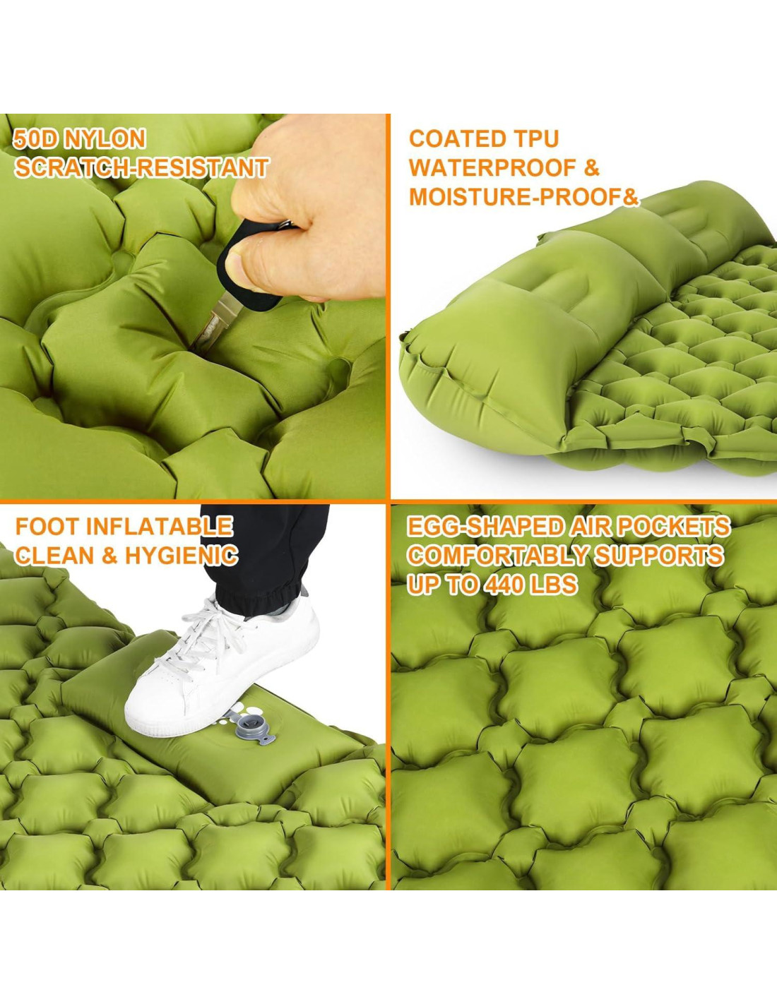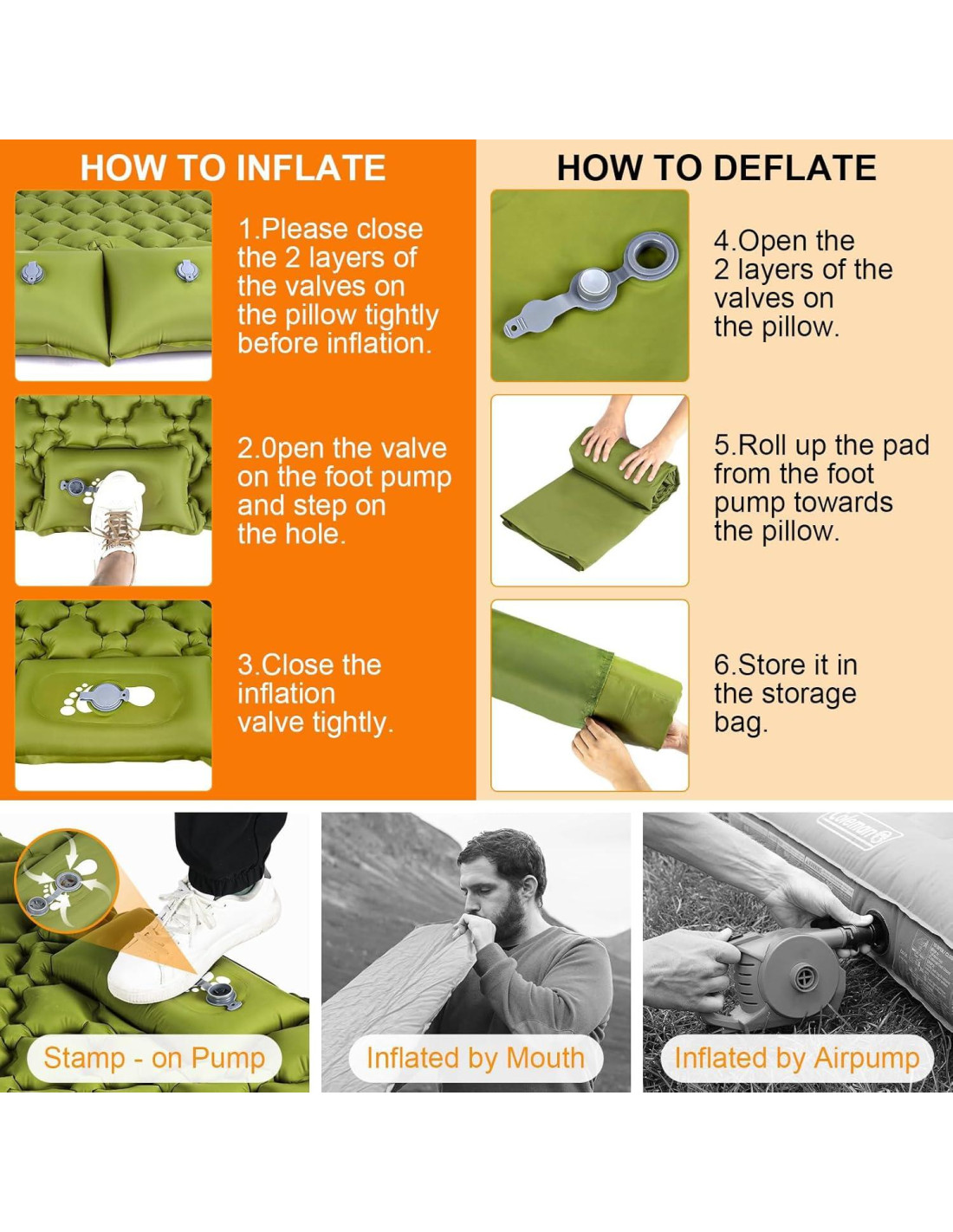 - [Inflado a Presión con el Pie - Solo se Necesita 1 min] El colchón de camping no necesita ser inflado con tus manos, boca o una bomba. Solo toma 1 min después de inflar completamente el colchón pisando el lugar de la bomba integrada con tu pie. Con películas anti-fugas en las válvulas, nunca tendrás que preocuparte por fugas de aire al usarlo. Además, es súper rápido desinflar - solo quita el tapón de desinflado. ¡Es hora de planear un camping y senderismo con nuestro innovador colchón de camping ahora!