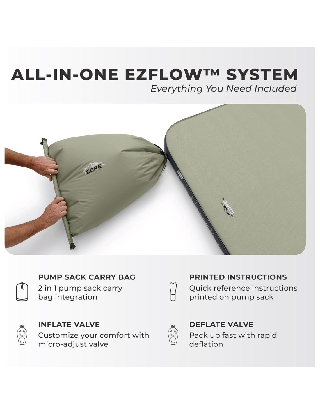 - COMODIDAD PERSONALIZADA: El sistema EZFlow y la bolsa de bomba incluida inflan el colchón en minutos; la función de microajuste incorporada personaliza la firmeza a tu preferencia