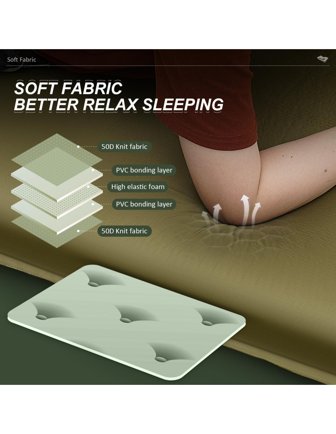 Hecha de tela de punto 50D, la colchoneta de espuma es resistente al agua y silenciosa al girar. Lo suficientemente suave para dormir. Tiene un grosor de 2.4" (6.1 cm) después de inflarse, lo que significa que no tocarás el suelo frío cuando duermas sobre ella y te brinda un ambiente cálido para dormir. Usamos material y diseño interno de primera calidad, esta colchoneta puede soportar 800 lbs (362.9 kg). Además, el tamaño adecuado puede soportar diferentes posturas de sueño. Con un valor R de 9.5, funciona para 4 estaciones en diferentes condiciones de senderismo. ¡Te brinda un sueño cálido y recupera tu energía para comenzar tu aventura!