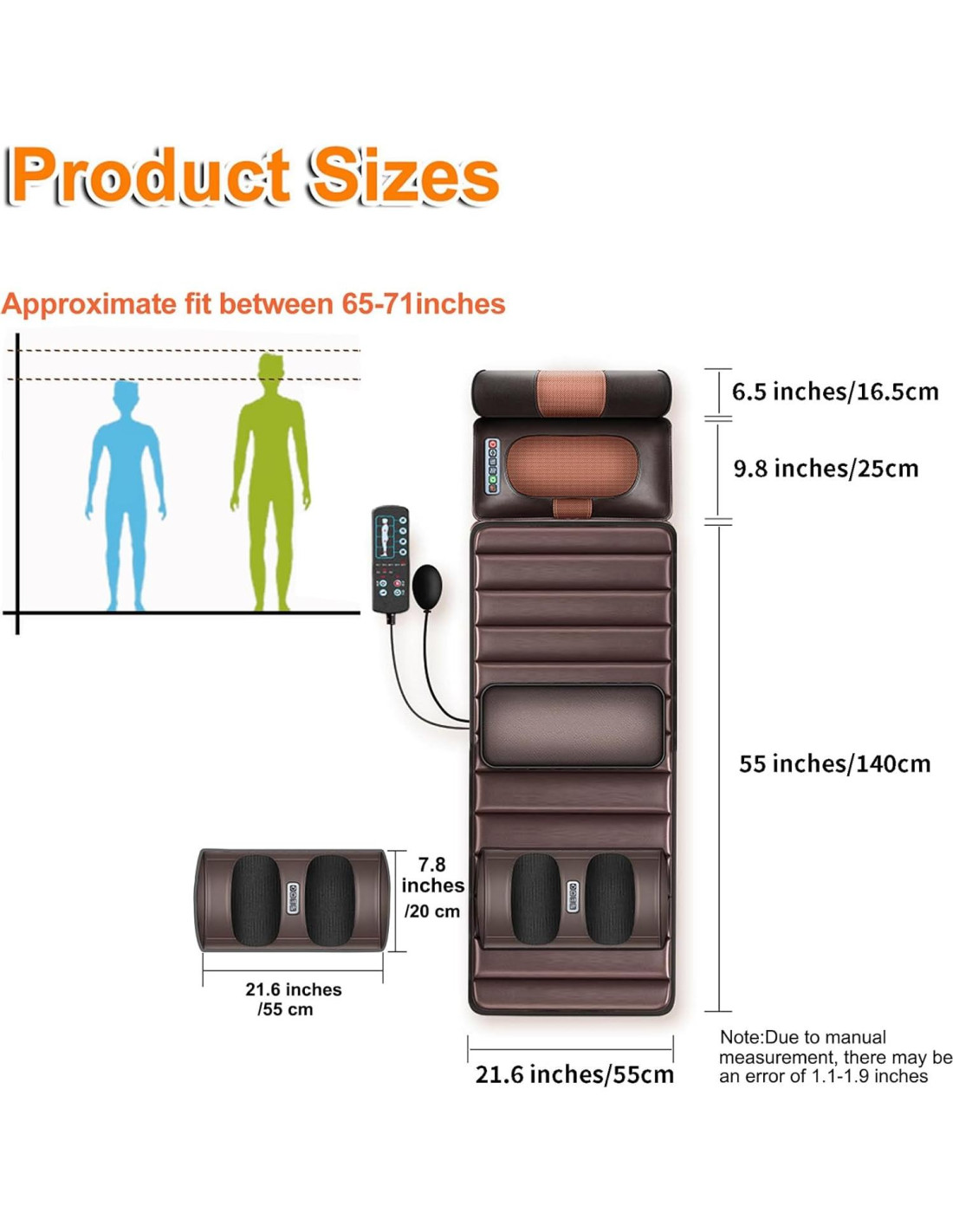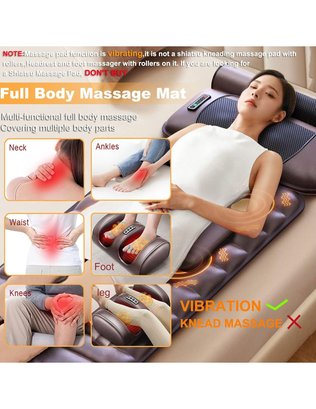 - Alfombrillas de Masaje para Vibración de Cuerpo Completo: La alfombra de masaje vibrante con calefacción está equipada con 54 cabezales de masaje y viene con una almohada de masaje para cuello shiatsu desmontable. La almohadilla de masaje puede relajar sus hombros, espalda, piernas, pies y otras partes de su cuerpo con la función de vibración, ayudándole a aliviar la tensión muscular, el estrés y la fatiga.
