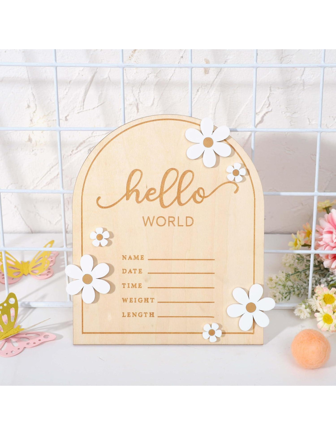 - DISEÑO ÚNICO - Nuestro Tablero de Anuncio en Forma de Arco es Bellamente Único y Decorado con Flores de Margarita para Registrar Todos los Detalles del Nacimiento de Su Bebé, y Tiene un Aspecto Natural y Rústico que Complementa Cualquier Decoración.