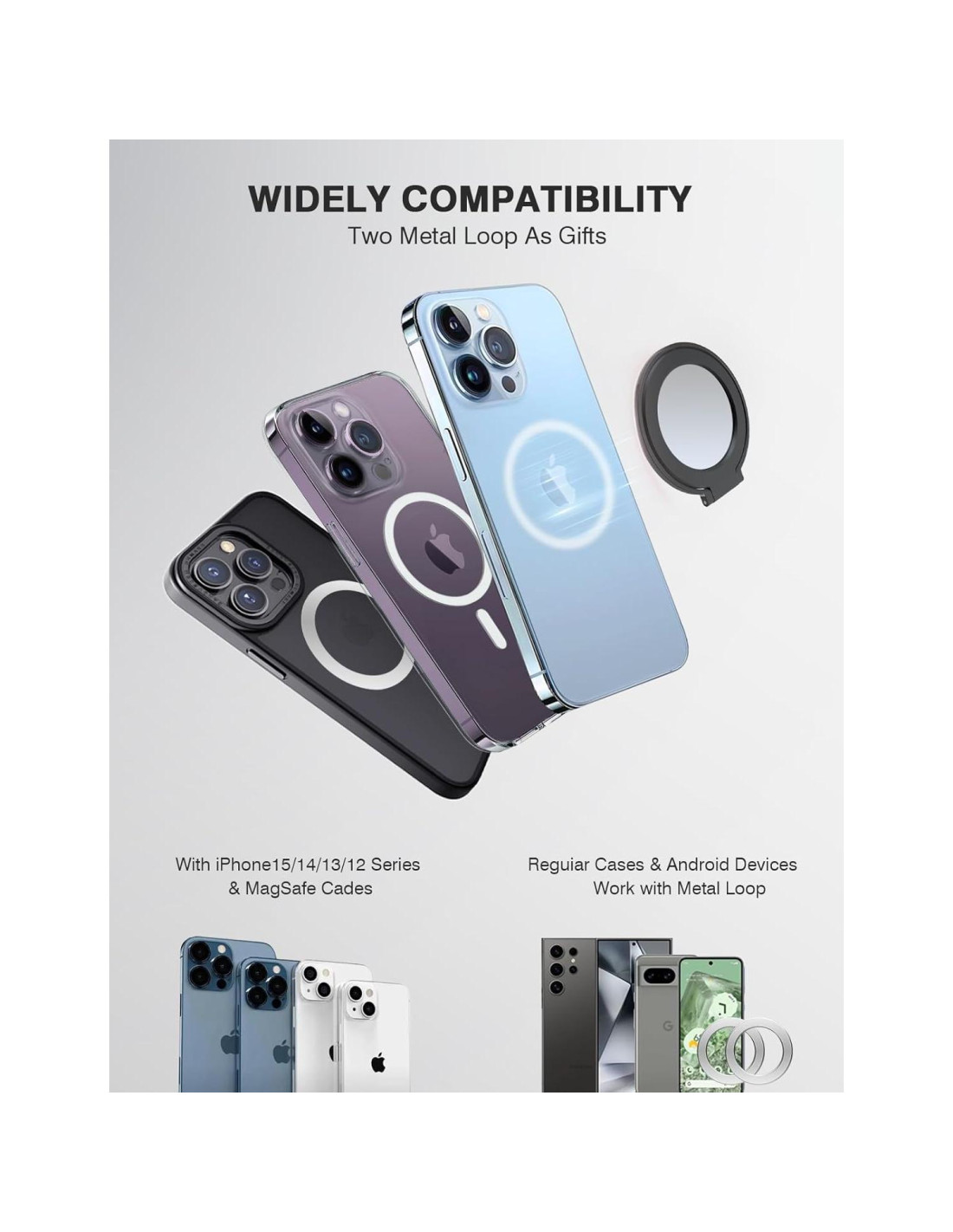 - Amplia compatibilidad - Dispositivos iPhone y Android Este soporte magnético puede engancharse directamente al iPhone 12/12Pro/12ProMax, 13/13Pro/13ProMax, 14/14Pro/14ProMax, 15/15Pro/15ProMax, 16/16Pro/16ProMax, o las fundas magnéticas MagSafe. Ofrecemos dos lazos metálicos como regalo, haciendo que el soporte Gornergrat sea compatible con todos los smartphones, incluyendo iPhone 11/11Pro/X/XS/XS Max/8/7, Samsung Galaxy/Note/Flip series, Google Pixel series, y más dispositivos Android.