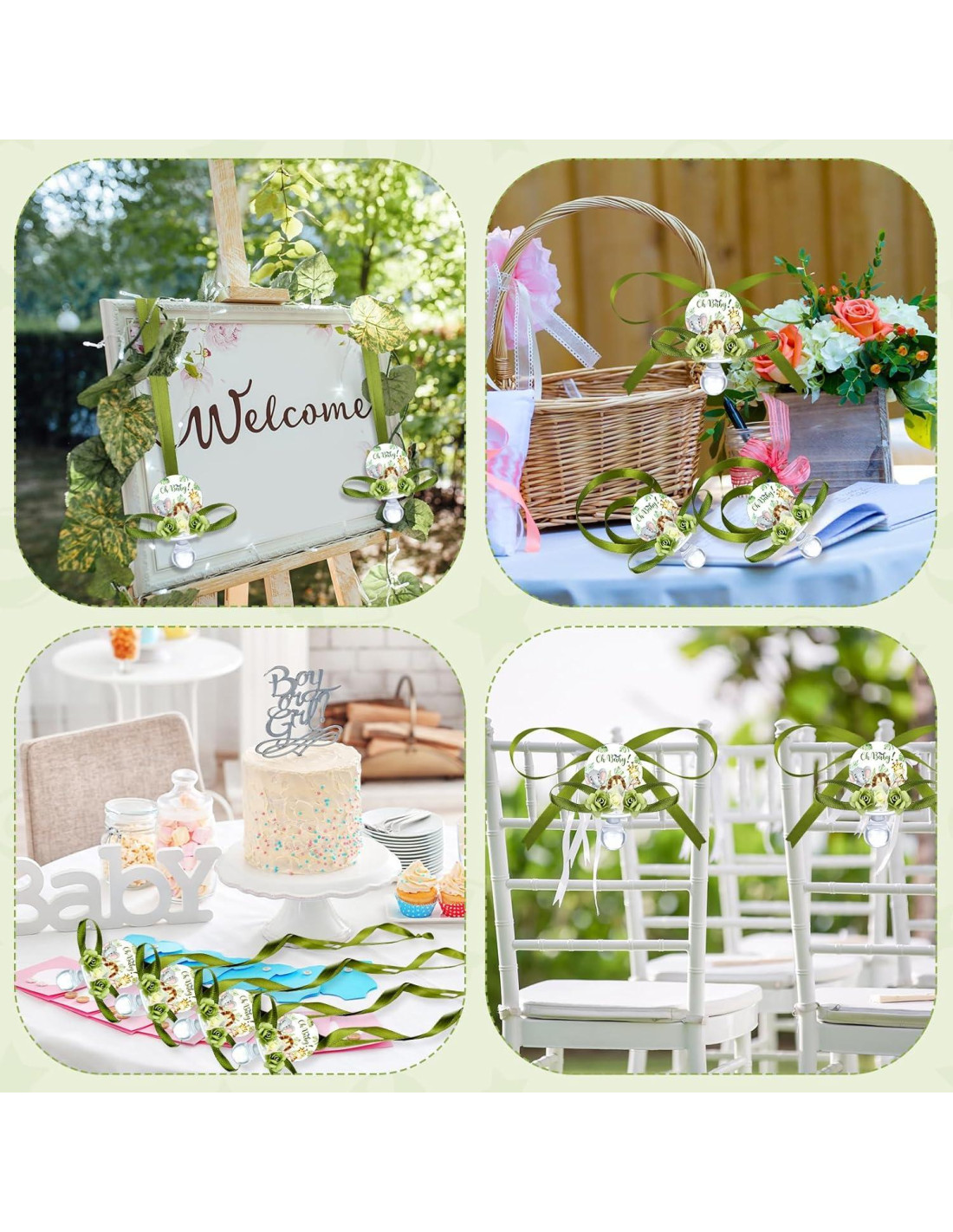 - Sin Montaje Necesario para Tu Conveniencia: nuestros collares de chupete para baby shower con tarjeta no requieren montaje, haciendo que tus deberes de anfitrión sean más fáciles; Puedes concentrarte en crear un ambiente cálido y acogedor para tus invitados sin preocuparte por el proceso de montaje que consume tiempo