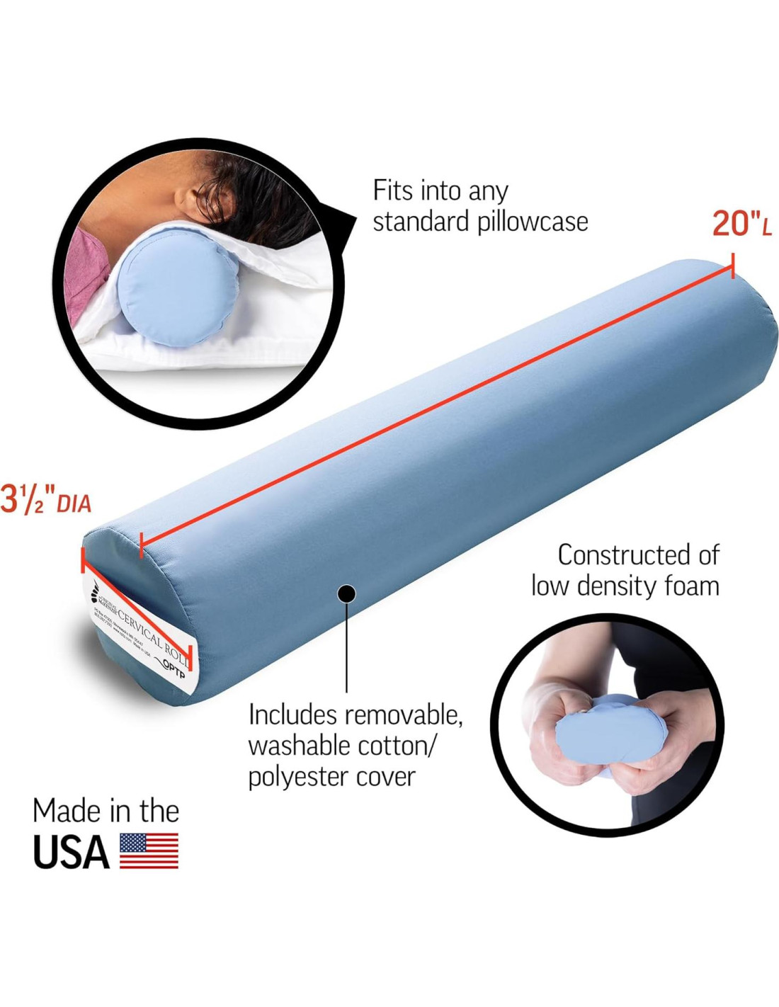 - Almohada Cervical Redonda, Promueve una Buena Postura: Esta almohada para la columna cervical soporta el cuello durante el sueño para promover una buena postura y hábitos de sueño naturales. Hecho en EE. UU. Mide 20" (50,8 cm) de largo x 3.5" (8,89 cm) de diámetro.